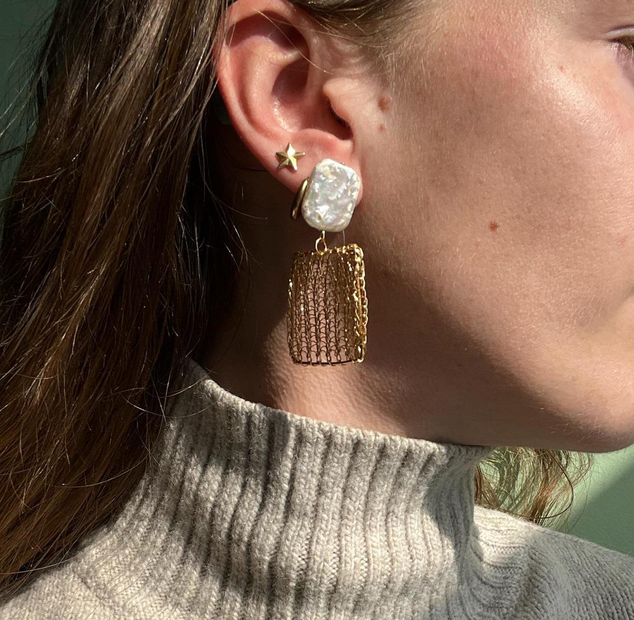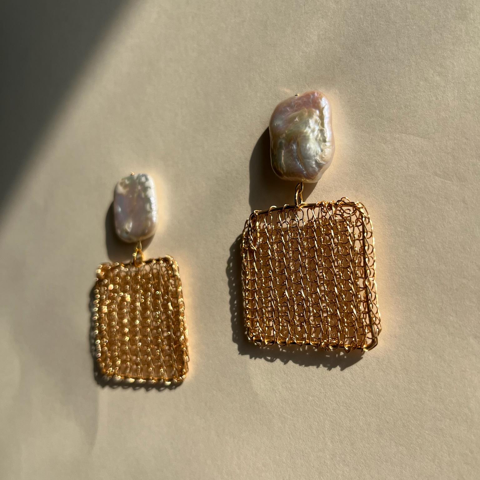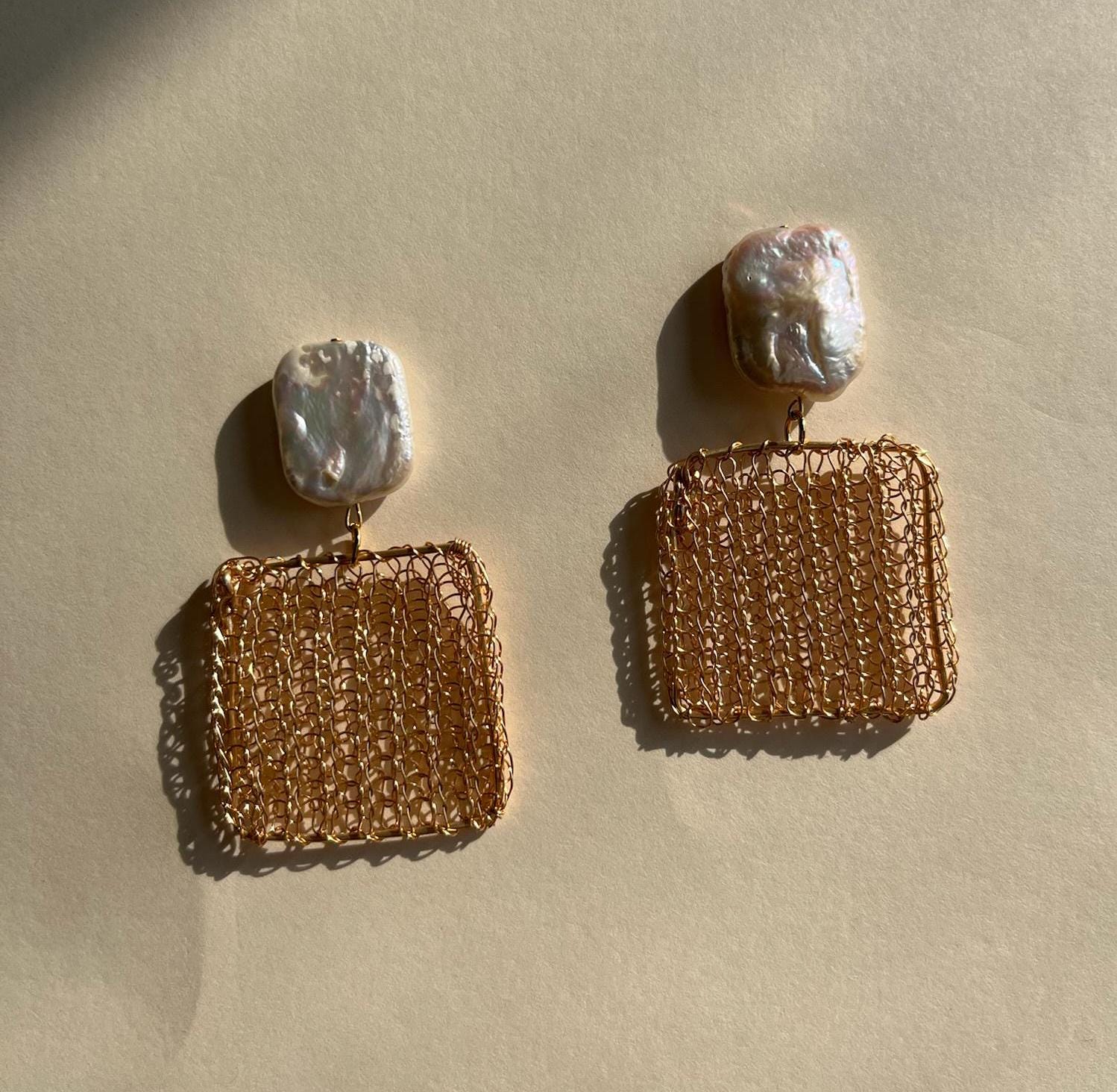 Pearl earrings designed to make an impact. These hand knitted keshi pearl earrings feature rare square keshi pearls suspended from sculptural, 24k gold plated pearl drop earrings, created as bold yet refined statement earrings for women who love modern artisan design.