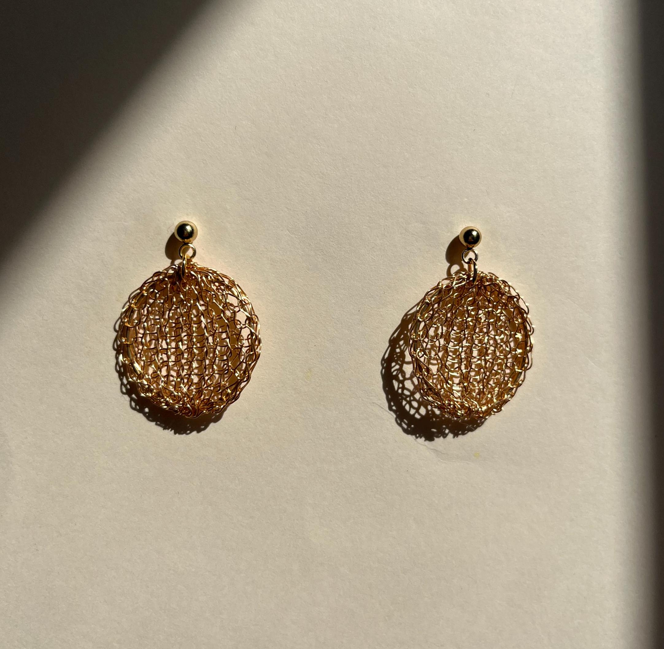 Each pair is hand-knitted by hand using 18k gold plated copper wire wrapped around a 1mm inner brass wire, finished with a 18k gold plated stainless steel ball stud. The result is a pair of artisan gold ball stud earrings with a soft sculptural shape and subtle vintage character: timeless, modern, and intentionally imperfect.
