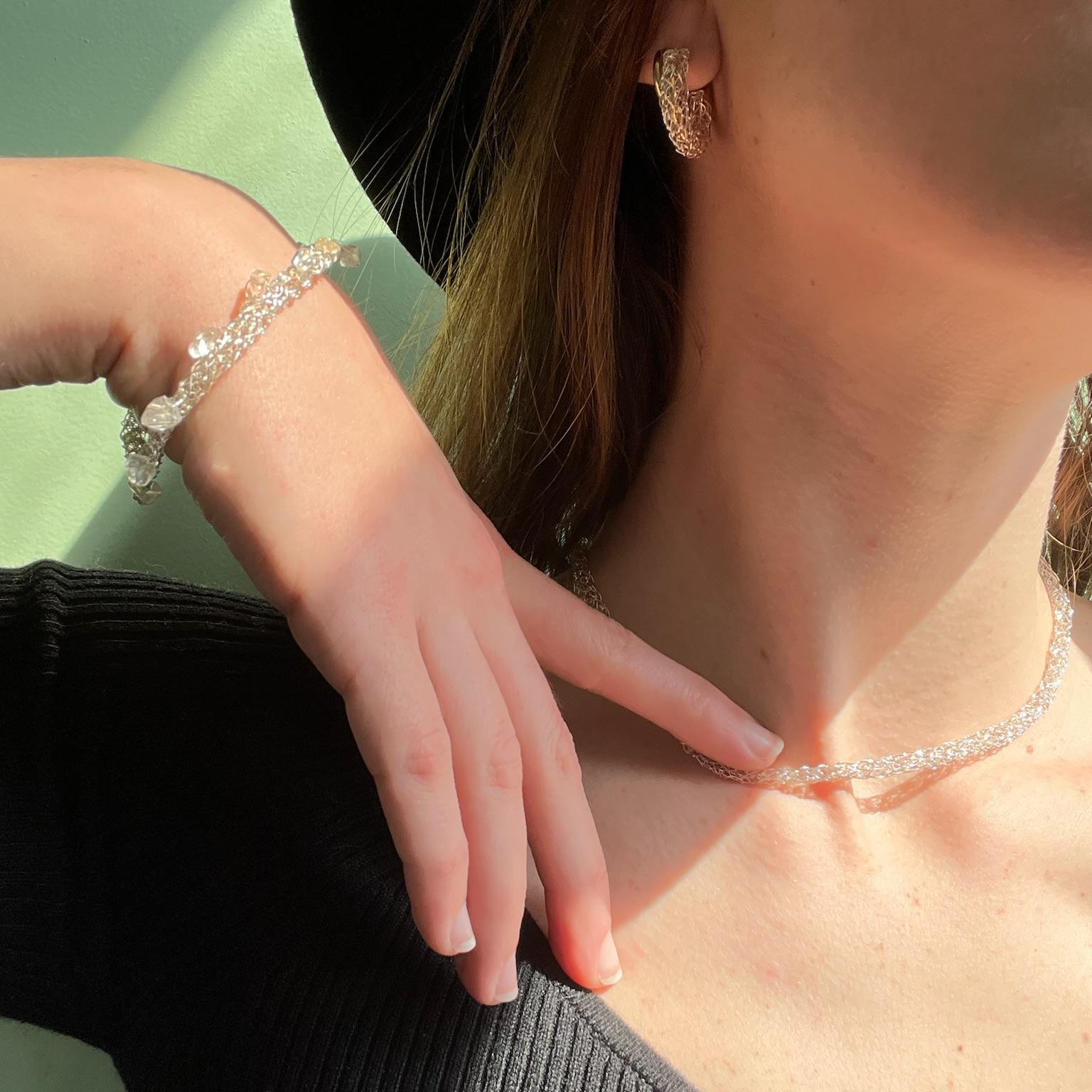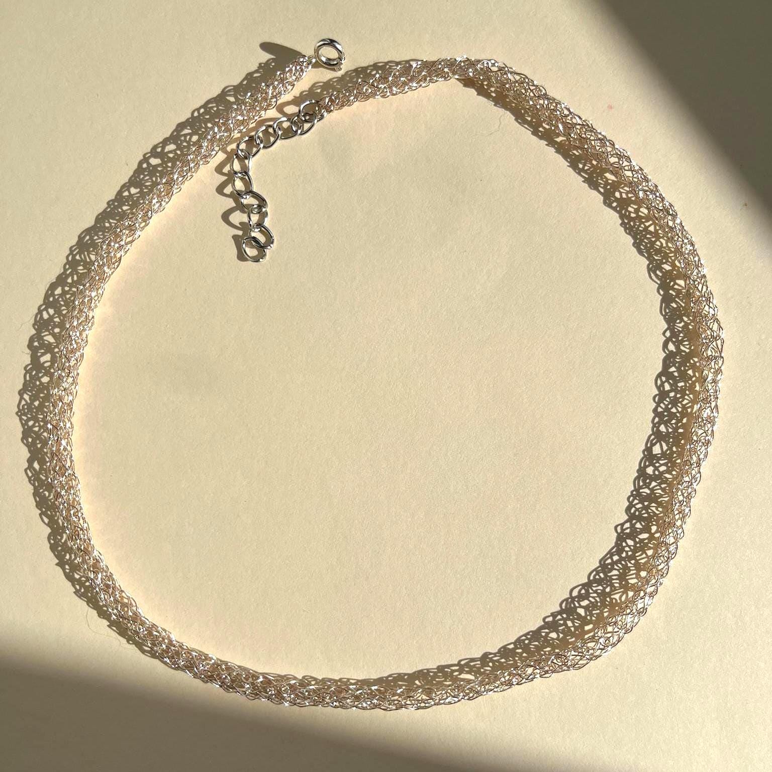 This Silver Choker Necklace is the definition of understated elegance: a minimalist wire knit jewelry piece handcrafted in Barcelona. Made from 925 sterling silver–plated wire with a soft metallic sheen, it adds just the right touch of sophistication to any outfit. Lightweight, dainty, and effortlessly chic, this hand-knitted silver plated wire choker necklace embodies timeless craftsmanship and modern design.