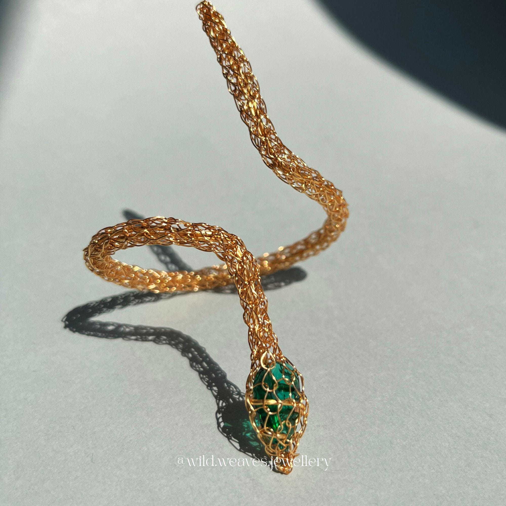 Unleash bold elegance with this 18k gold snake cuff bracelet with emerald green stone, a striking piece of handmade serpentine jewelry. Crafted using intricate wire crochet techniques with gold-plated copper and a hammered brass core, this statement bracelet combines strength, artistry, and luxury. The centerpiece, a vivid green pear-cut glass stone, evokes the mystery of emeralds, adding a powerful and enchanting touch.