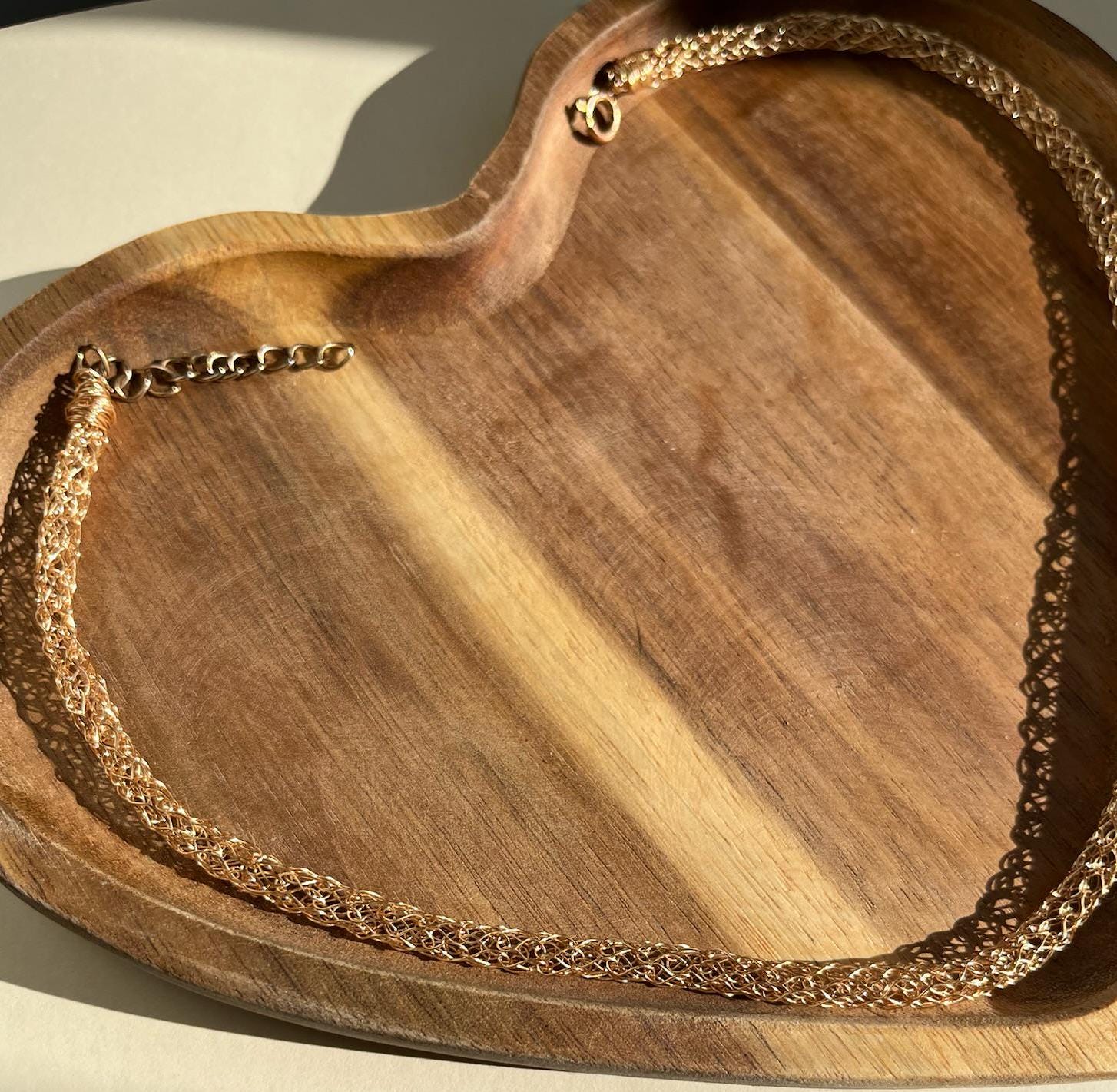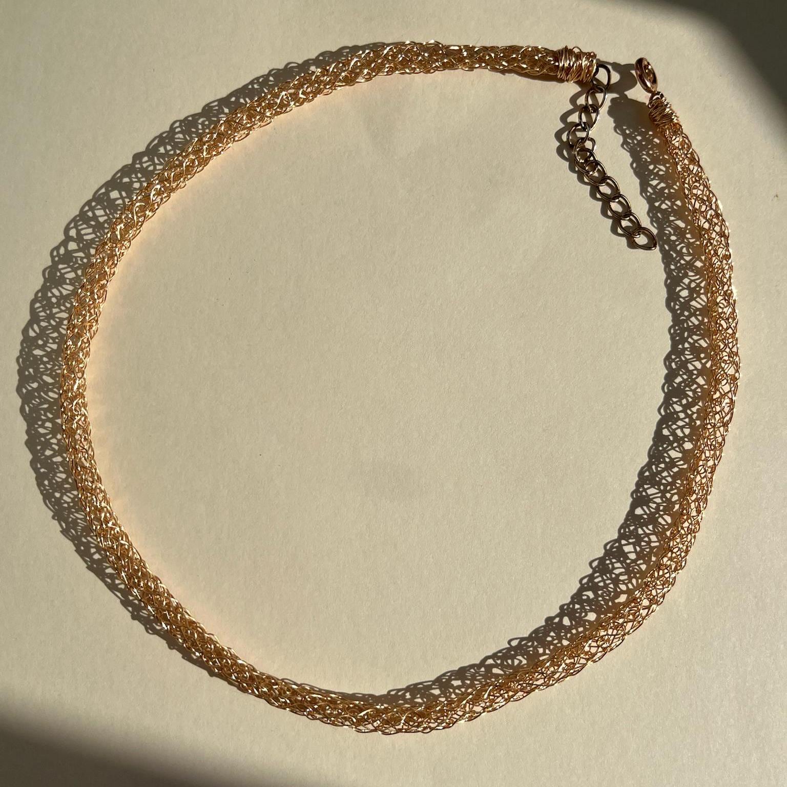 Each choker is individually crafted using 18k gold plated copper wire, finished with an 18k gold plated adjustable chain and a durable stainless steel clasp, ensuring long-lasting shine and strength. The fine knitwork creates a lightweight, flexible texture that feels soft and comfortable against the skin, a piece designed for both modern minimalism and timeless femininity.