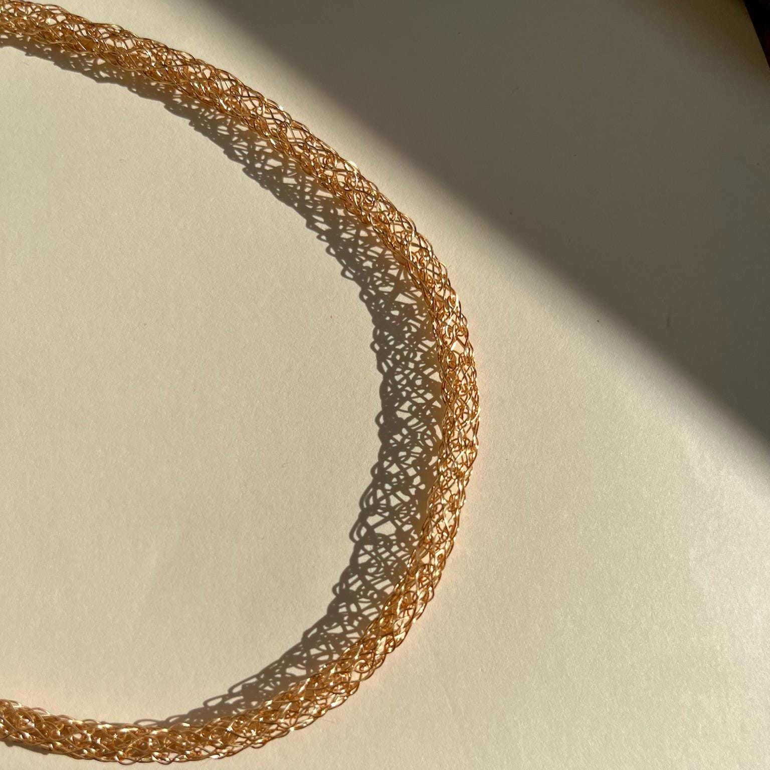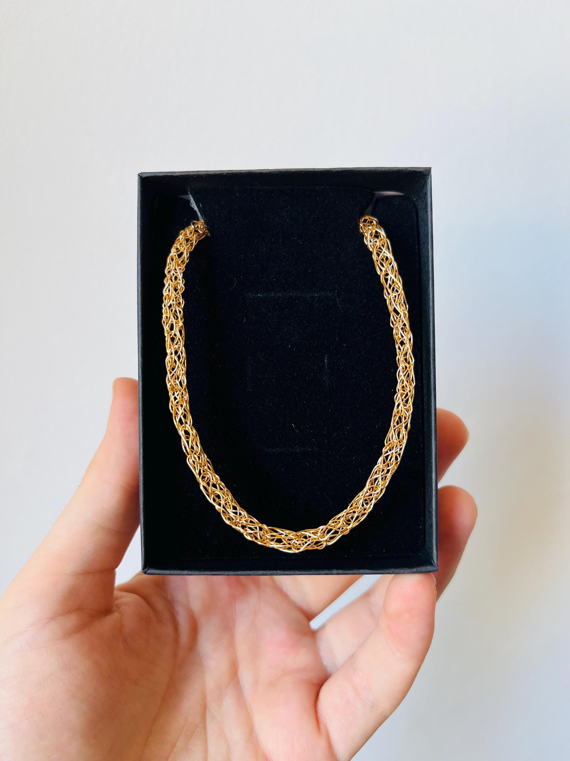A delicate statement in gold: refined, timeless, and handmade. This 18k gold plated choker necklace features a hand-knitted wire design, bringing together the craftsmanship of artisan jewelry with the elegance of minimalist fine design. Perfect for layering or wearing solo, this dainty gold necklace catches the light with a subtle shimmer that elevates any look from everyday sophistication to evening luxury.