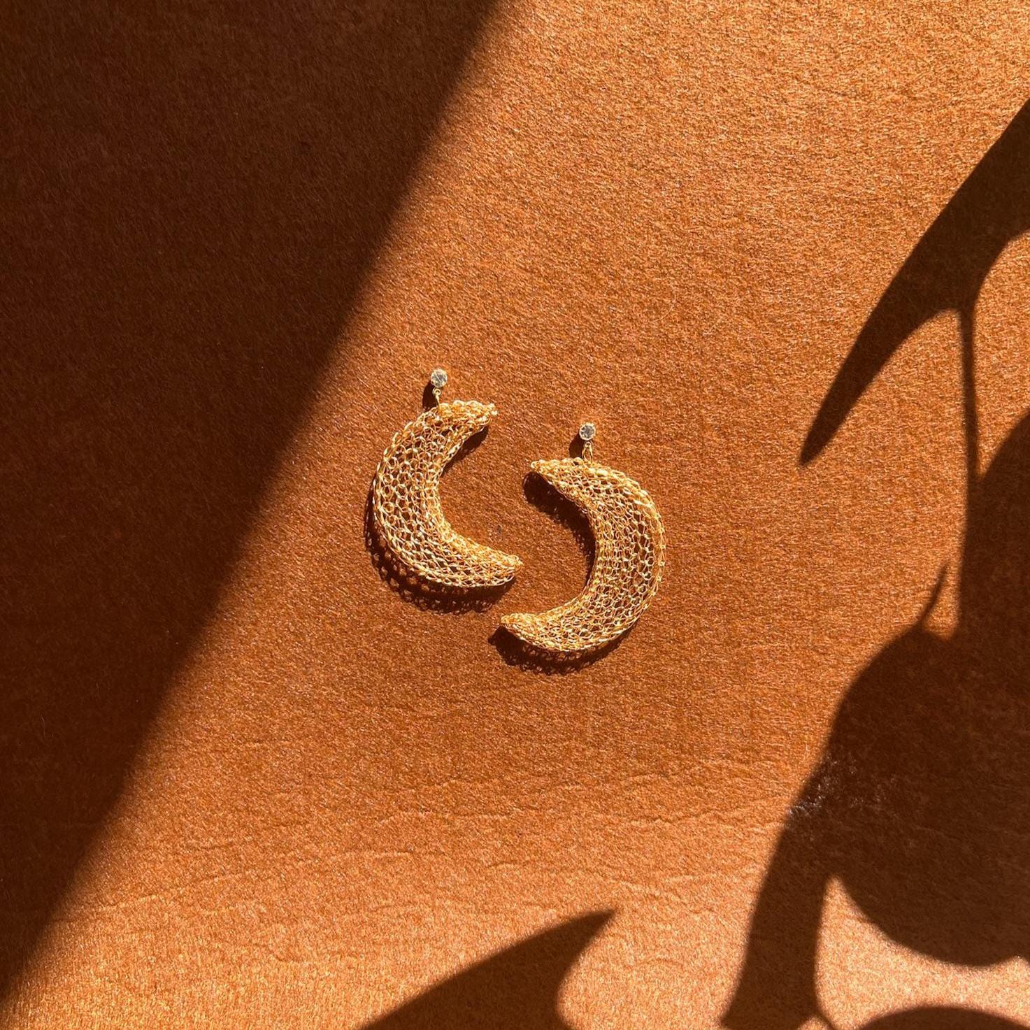 Each pair features sculptural moon shapes formed with an inner brass wire and an outer layer of 18K gold plated copper wire, finished with shimmering cubic zirconia studs. The result is a pair of handmade moon earrings that feel both bold and refined, perfect for women who love celestial jewelry with presence and meaning.