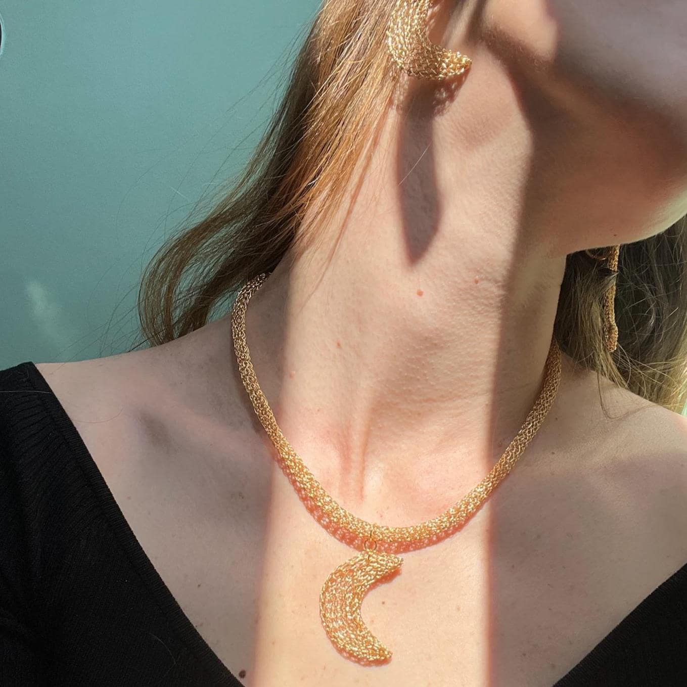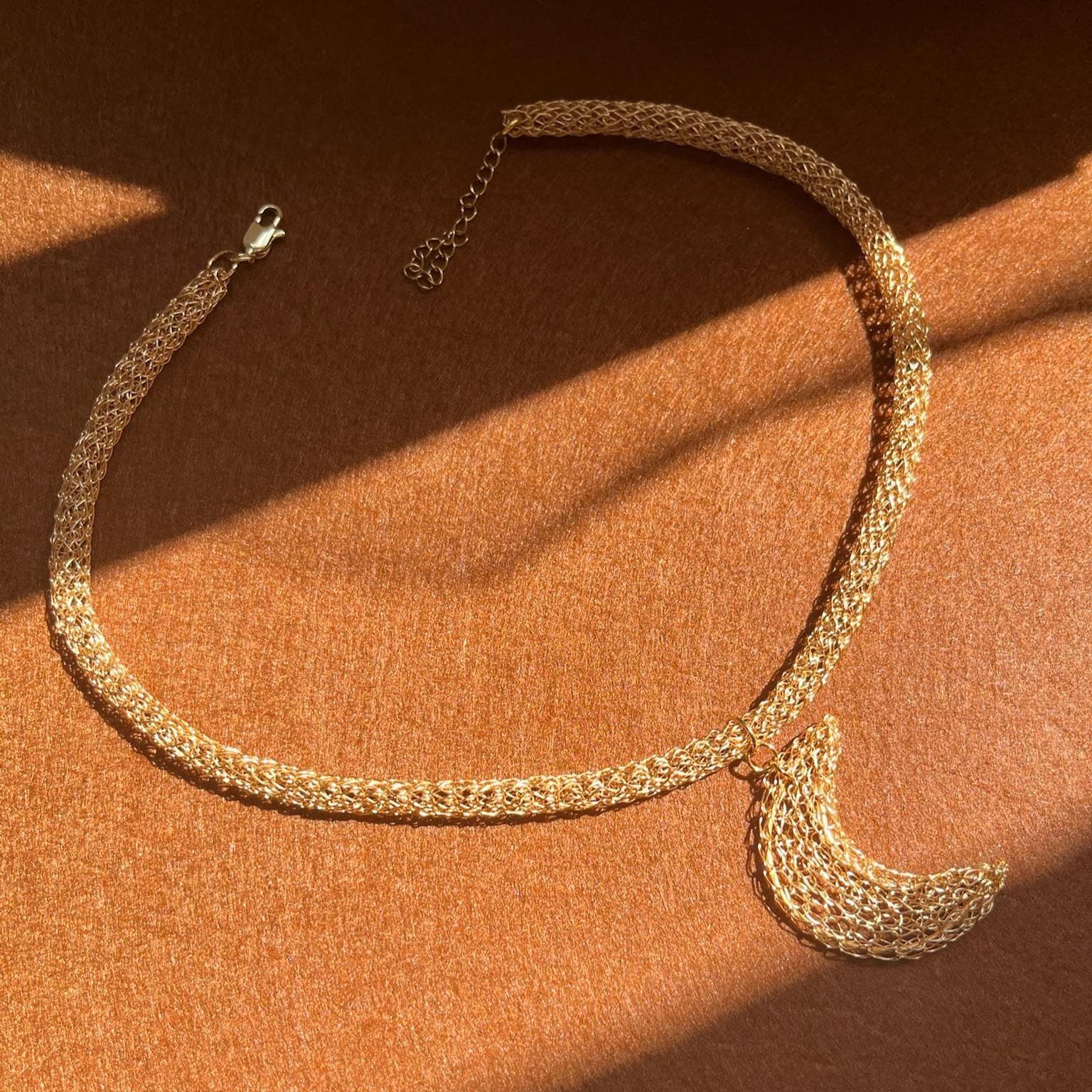 Each necklace is knitted by hand using 18k gold-plated fade-resistant copper wire, finished with a secure lobster clasp and a polished moon centerpiece that captures the soft shimmer of moonlight. Lightweight yet durable, it sits gracefully on the collarbone: a modern reimagination of boho luxury.