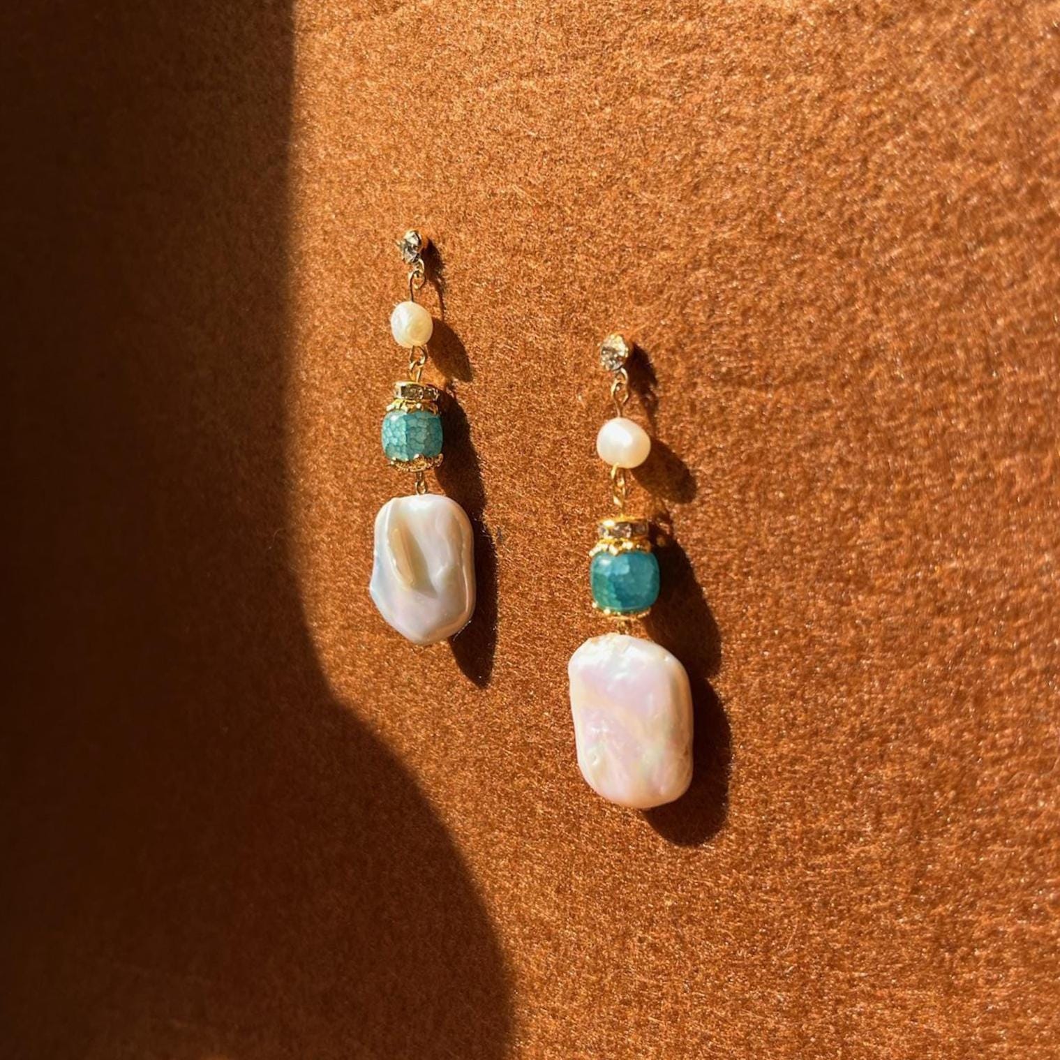 Inspired by Mediterranean light and old-world craftsmanship, these handmade earrings feature cultivated keshi baroque pearls, natural turquoise stones and textured gold plated elements. The combination of organic pearls and vibrant turquoise creates a striking contrast: feminine, bold, and unmistakably artisan-made.