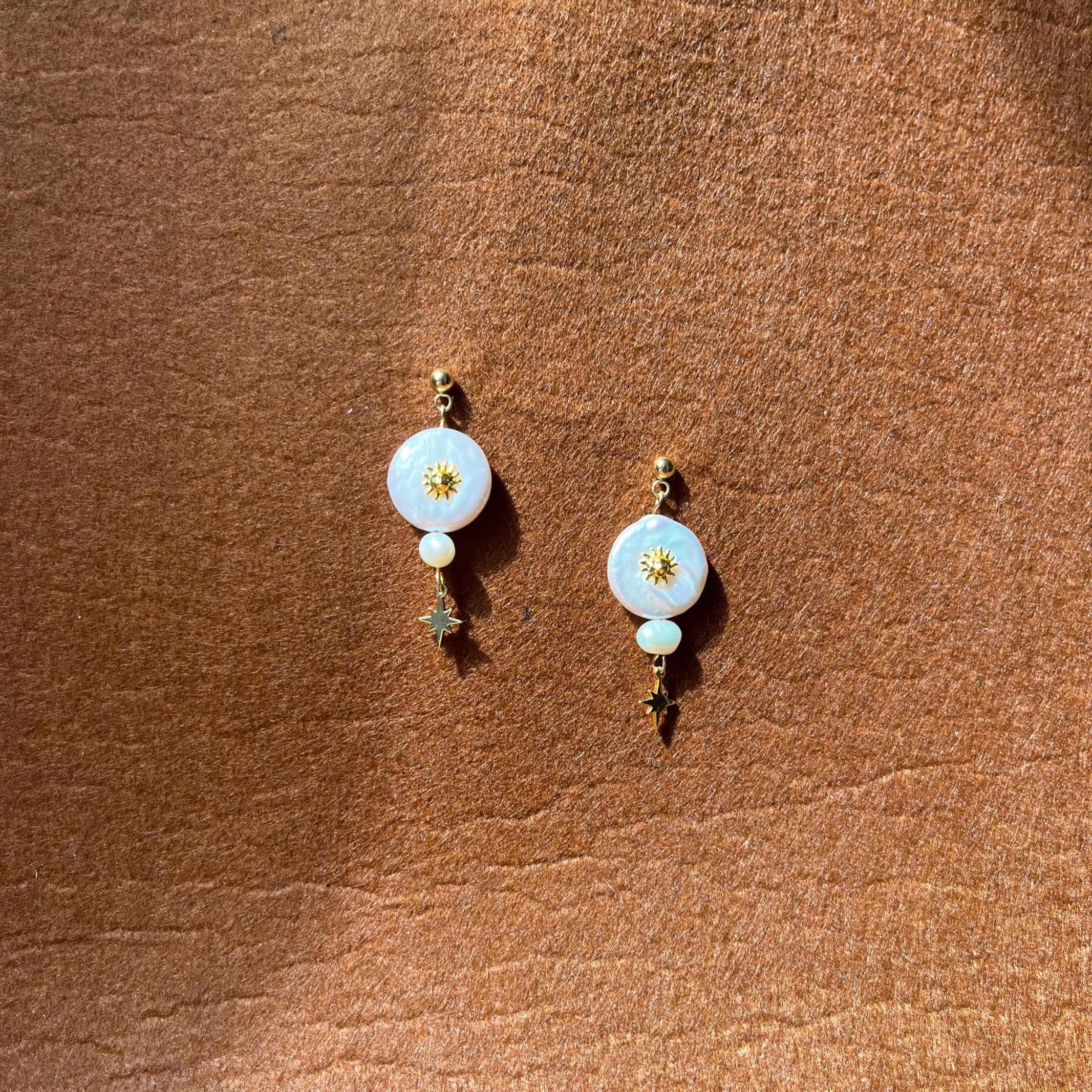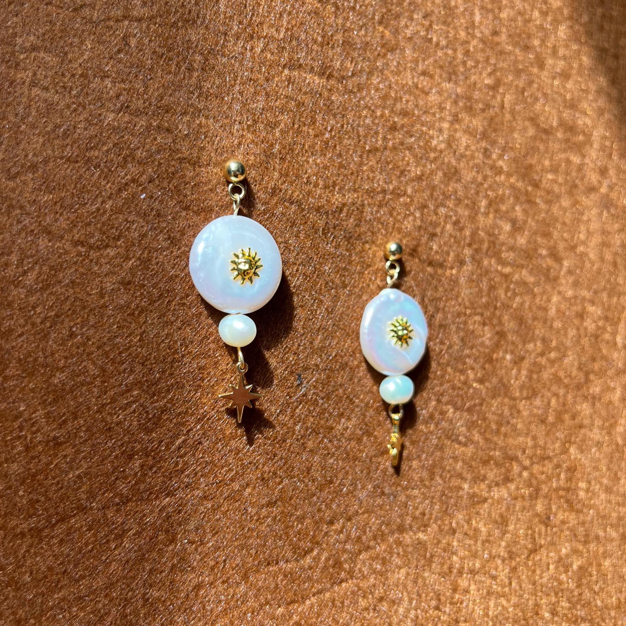 Each earring features a round flat keshi pearl paired with a delicate baroque pearl, finished with a shimmering gold-plated sun motif and star accent. The mix of textures—from smooth pearls to hammered gold—creates a luminous design that feels both artisanal and unique.