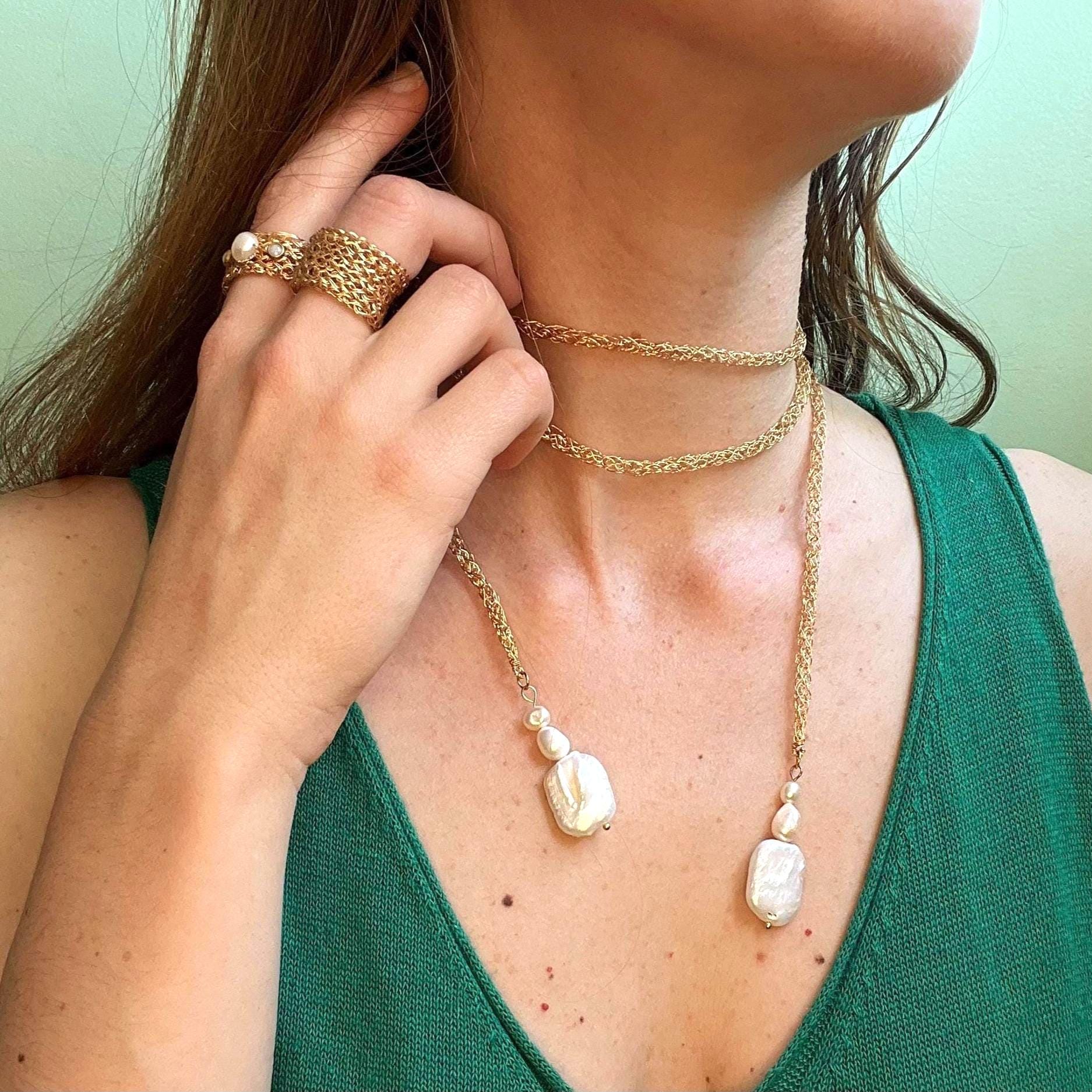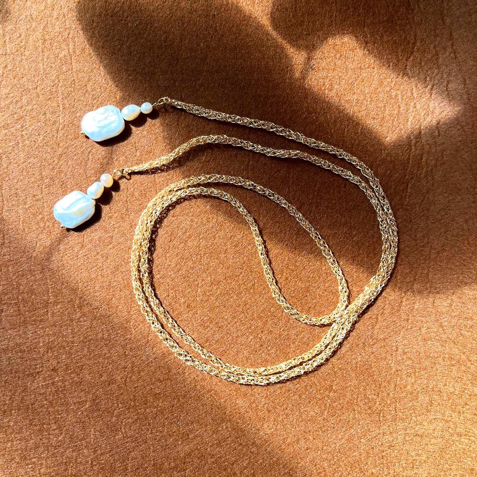 Handmade in Barcelona using the Invisible Spool Knitting (ISK) technique, this necklace features a luminous mix of natural rice, baroque, and keshi pearls woven onto a fine 18k gold-plated thread. It's delicate, versatile, and radiates that undone, sun-kissed beauty only natural materials can offer.