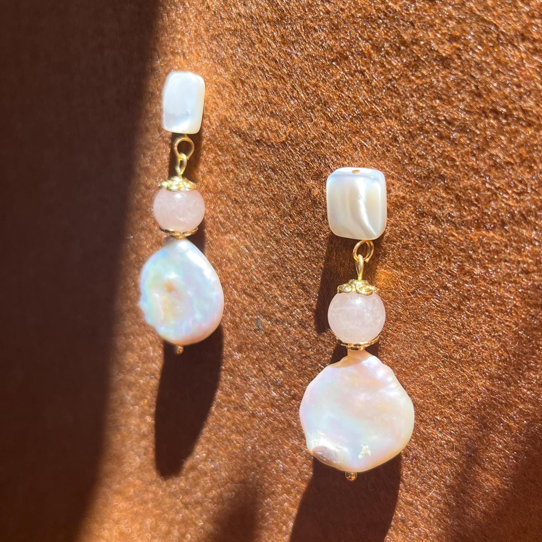 Each earring features a luminous keshi pearl, a soft blush rose quartz bead, and a square mother of pearl accent, all connected by delicate gold-plated floral details. The combination of natural stones and organic pearls makes every pair truly unique, catching the light beautifully with every movement.