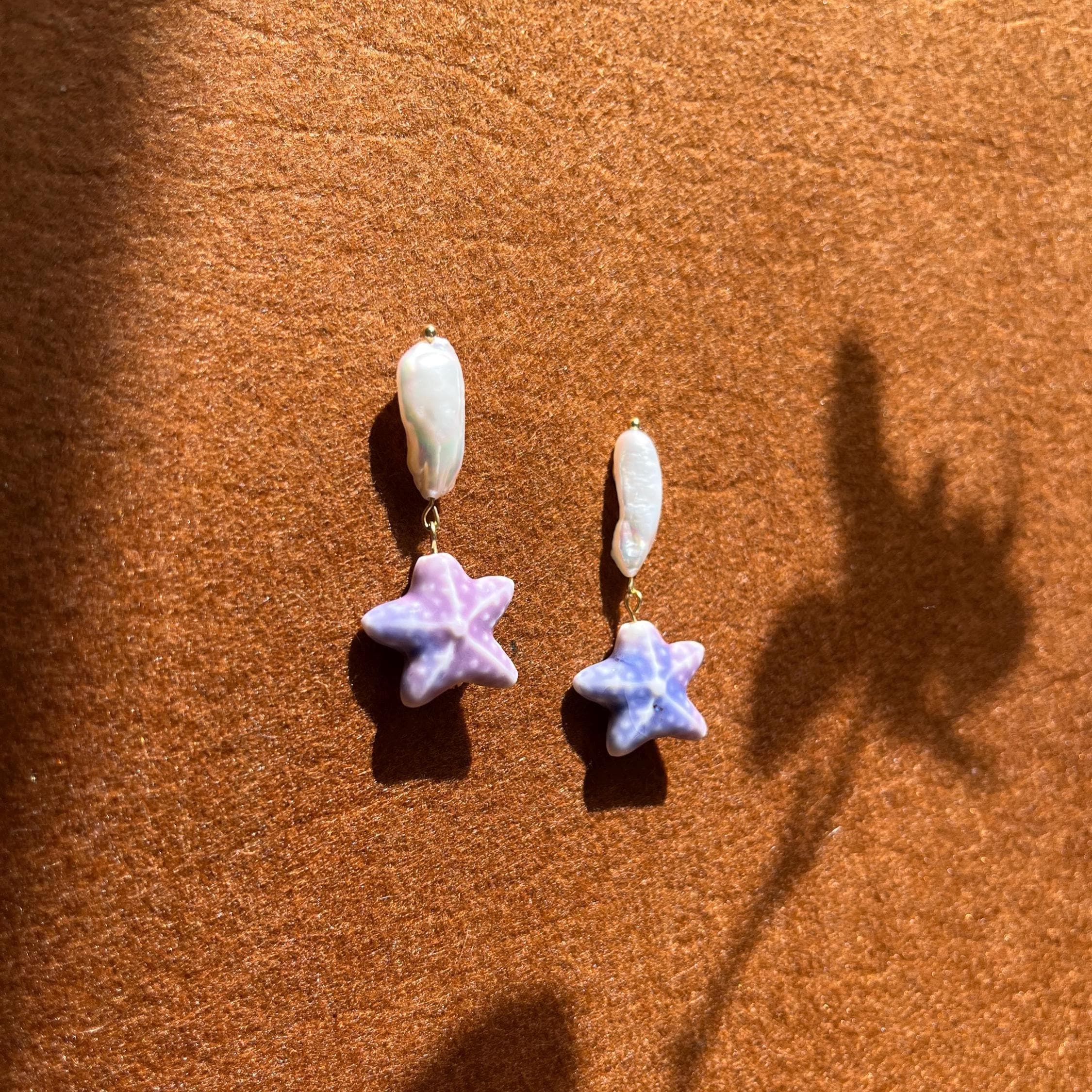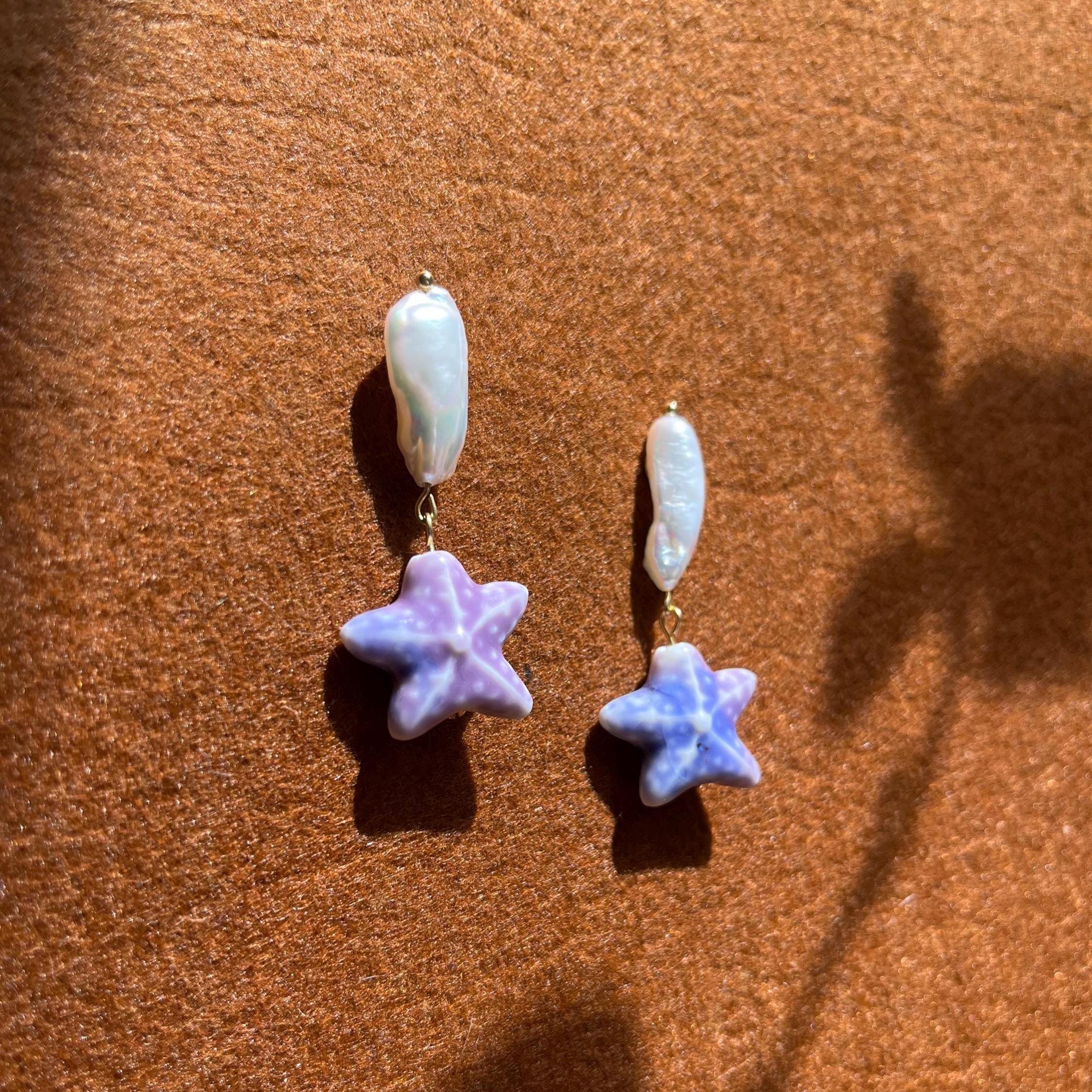 These artisanal earrings combine ocean-inspired design with modern craftsmanship, making them versatile enough to wear from a beachside brunch to a sunset celebration. Their balance of playful lilac ceramic and lustrous pearls ensures a one-of-a-kind accessory that feels both whimsical and timeless.