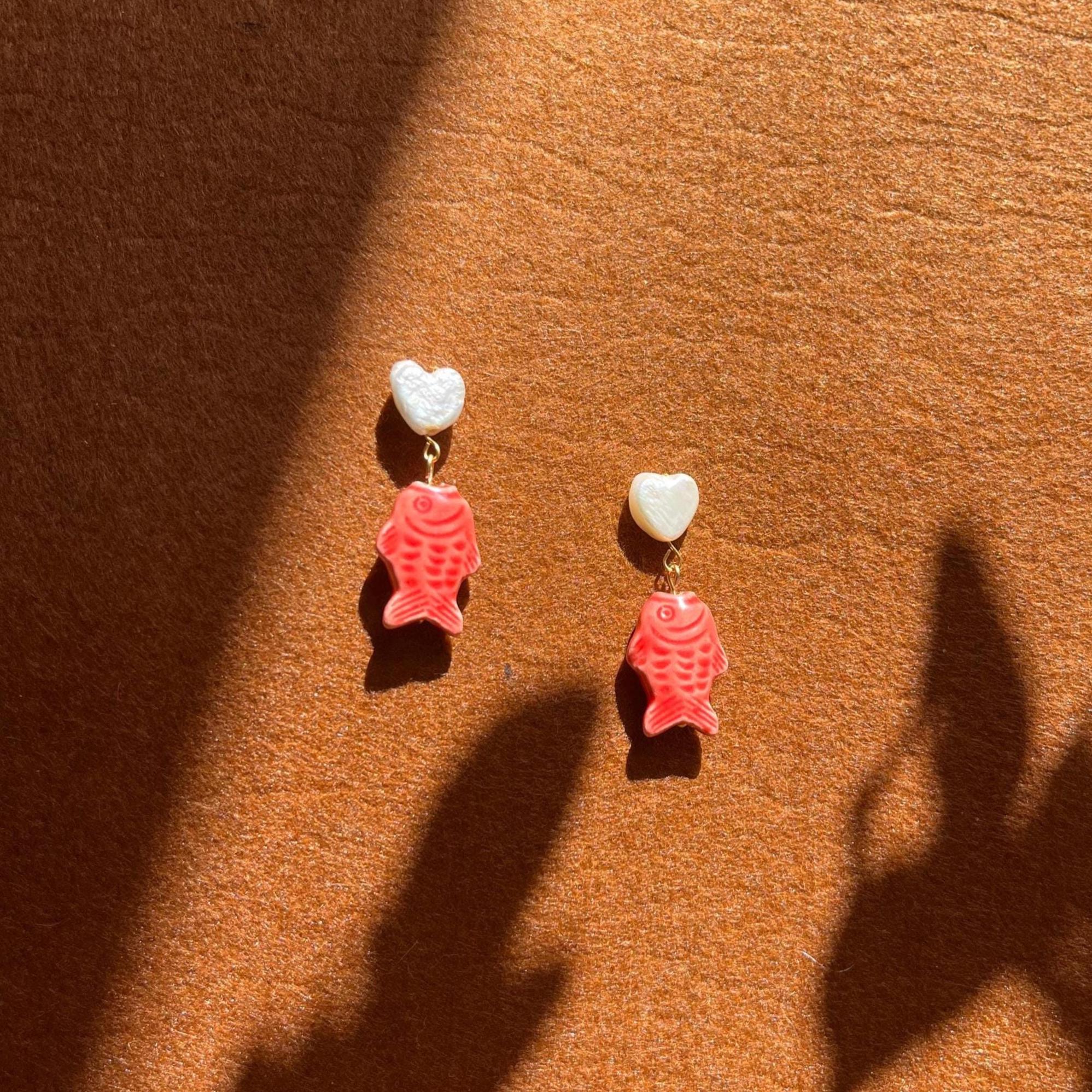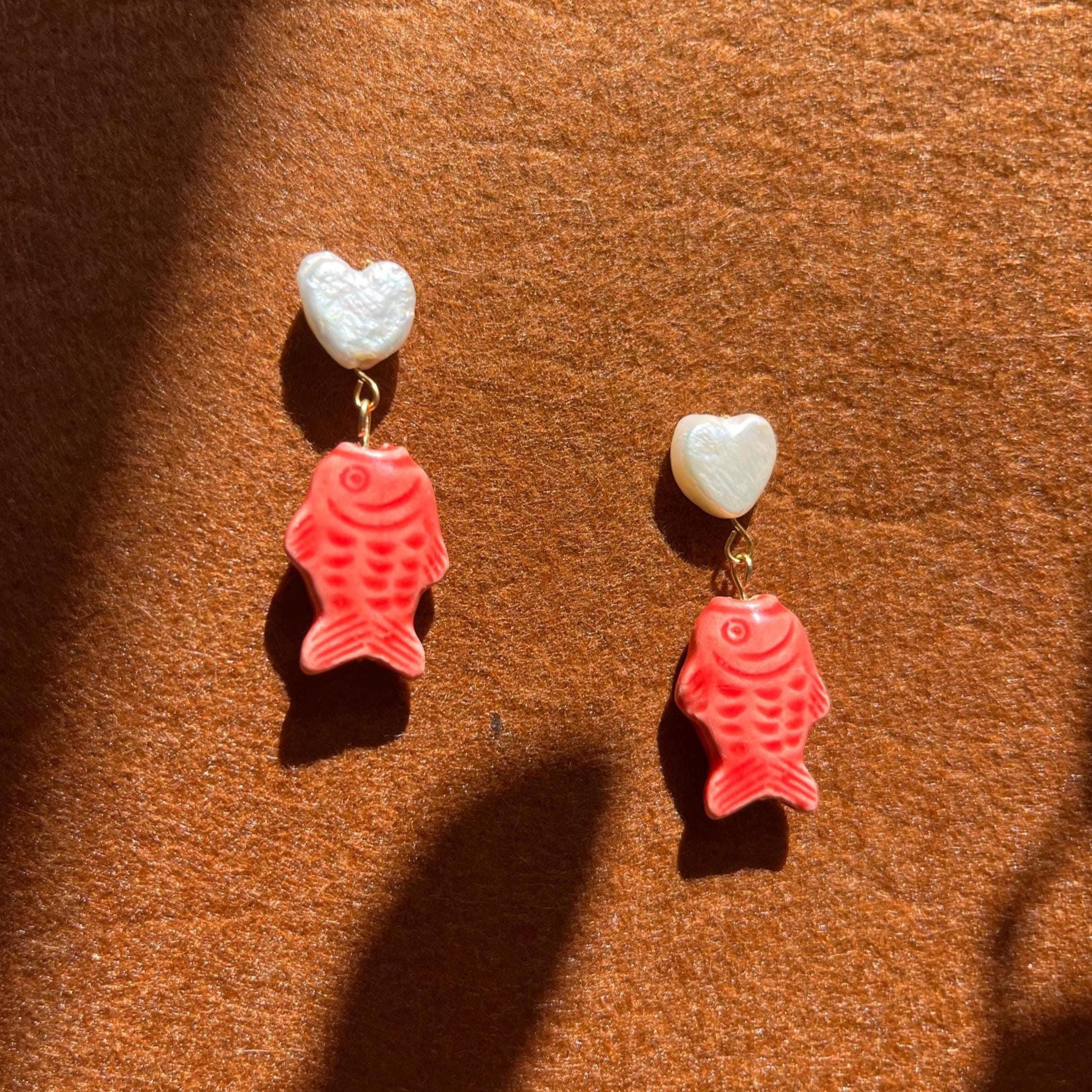 The bold red ceramic fish beads add a splash of color, while the luminous pearl heart charms bring softness and sophistication. Lightweight yet striking, they are versatile enough for both casual beach days and elegant evening occasions. Their boho-inspired design makes them a perfect gift for sea lovers, bridesmaids, or anyone who adores unique fish earrings with a romantic twist.