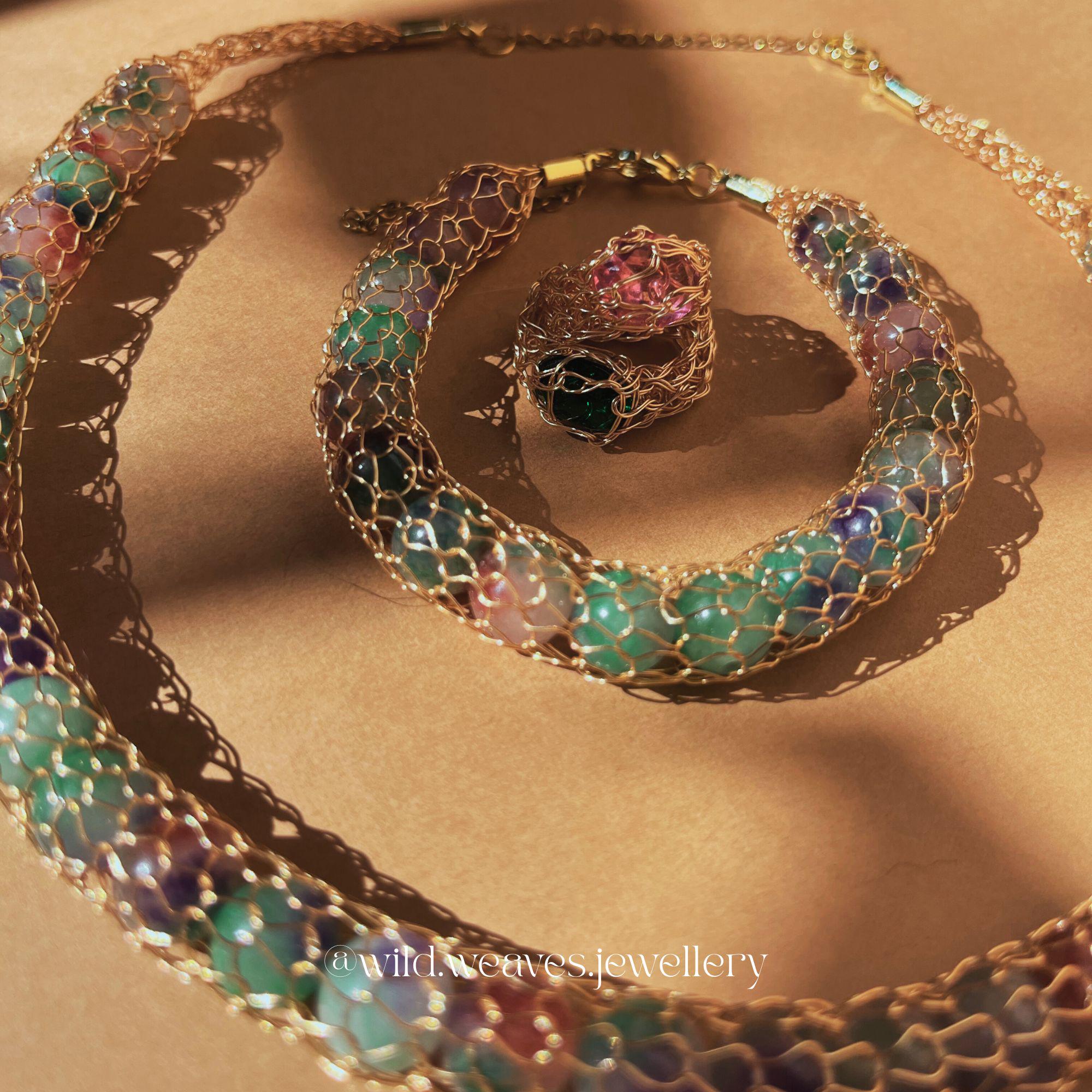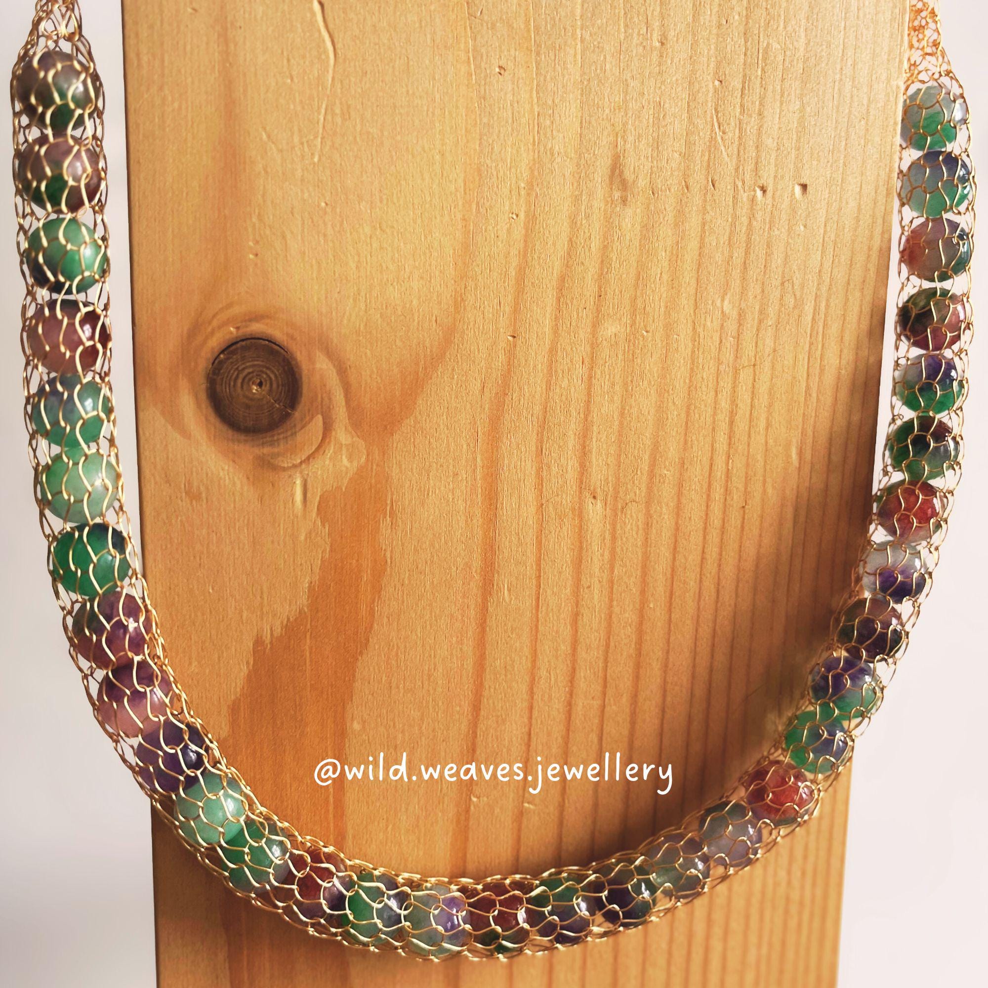 This unique choker features natural green, purple, and brown agate gemstones carefully enclosed in hand-knitted 18k gold-plated copper wire, creating a flexible, lightweight statement piece full of color, texture, and energy.