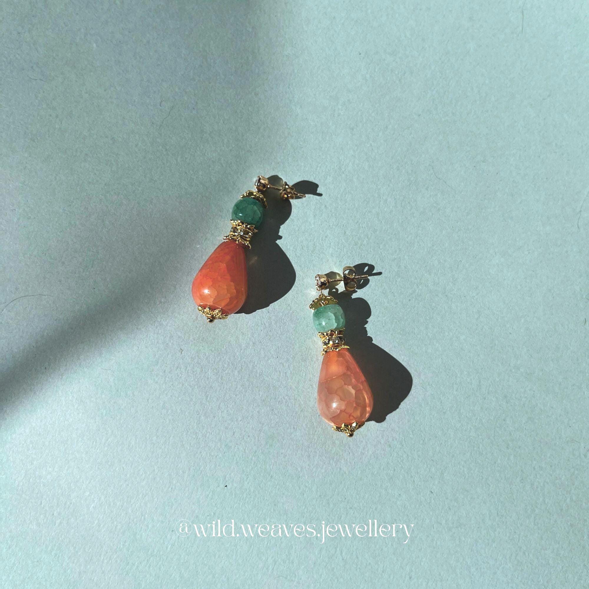 Step into the spotlight with these Orange and Mint Green Drop Earrings, designed in a bold and playful color palette that captures the energy of the stage. Featuring faceted orange agate teardrops, cool green agate beads, and sparkling cubic zirconia studs, they balance natural gemstones with glamorous detail.