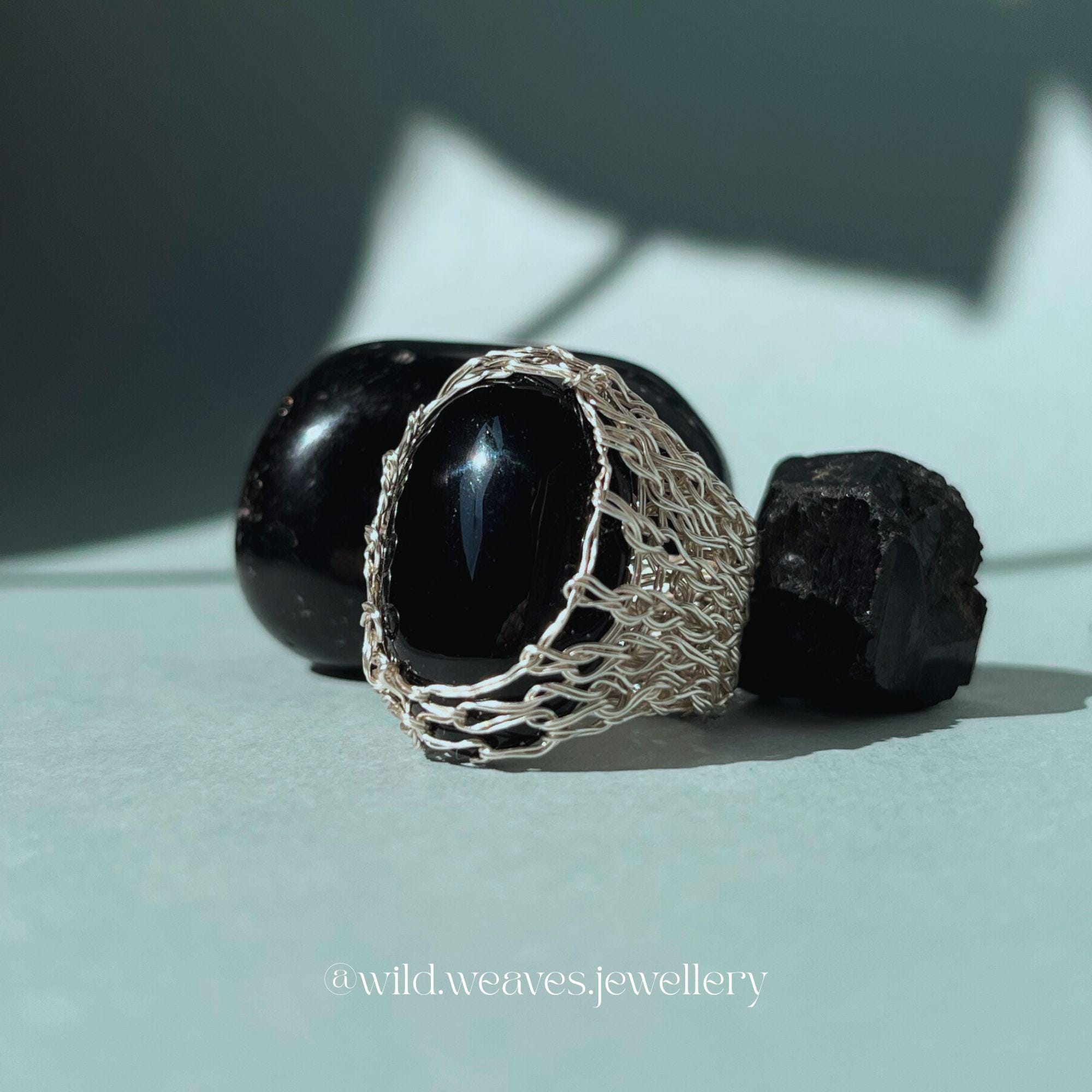 Bring the power of natural gemstones into your style with this handcrafted silver statement ring, featuring a large oval obsidian gemstone set in an intricate knitted silver band.
