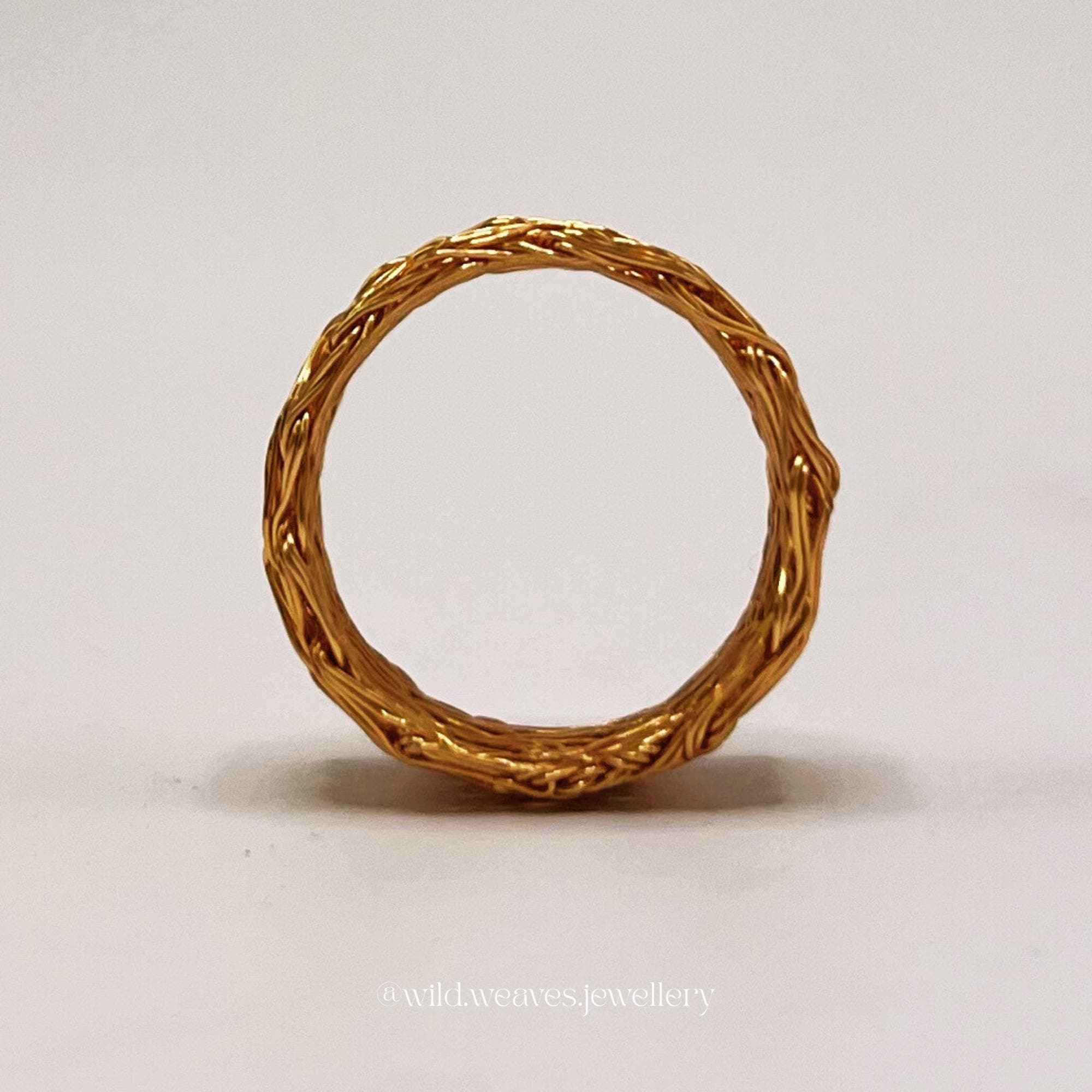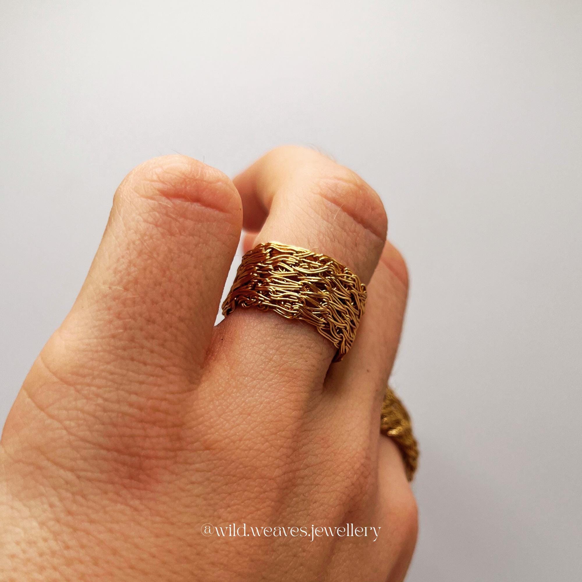 This chunky gold ring is a bold statement piece, meticulously hand-knitted from 18k gold plated copper wire to create a unique textured band ring that feels both luxurious and organic. Its sculptural design captures light beautifully, offering the perfect balance between raw craftsmanship and modern elegance. Every piece is handmade with double woven wires, giving it strength, comfort, and an unforgettable tactile texture.