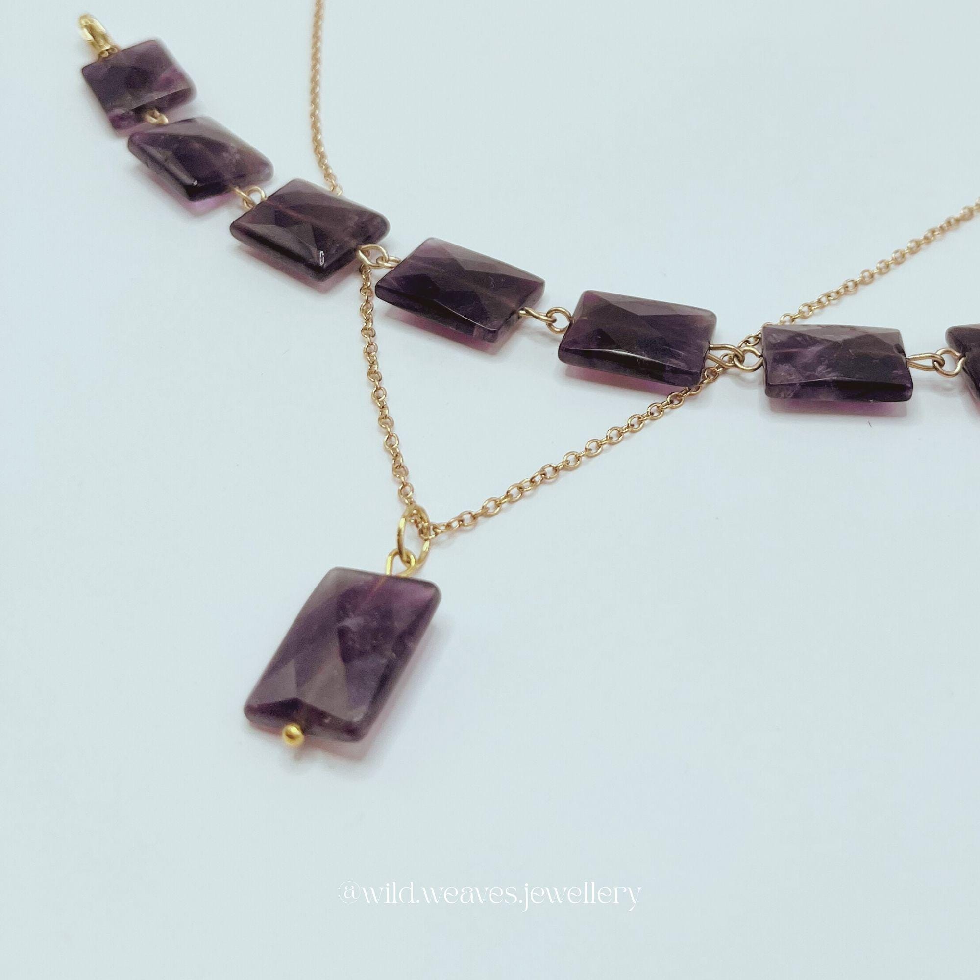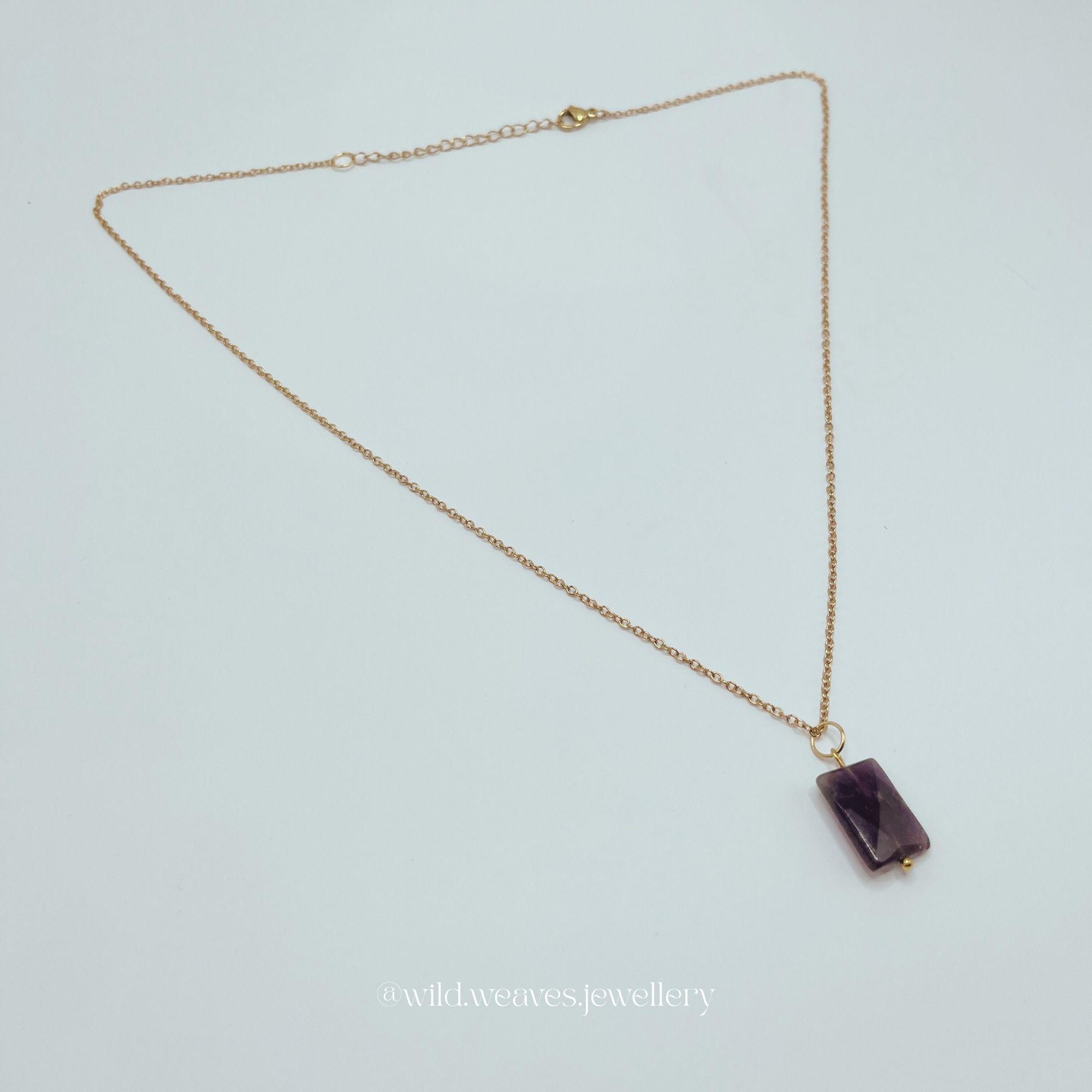 This Gold Amethyst Necklace features a faceted rectangular purple Crystal Pendant set on a gold plated chain, blending the natural charm of the gemstone with minimalist design. As a dainty gold plated necklace, it’s crafted to highlight the beauty of the rectangular purple-amethyst stone while offering an everyday, elegant touch. Perfect for lovers of amethyst necklaces, gold pendant jewelry, and handmade pieces, this unisex design suits every style and occasion.