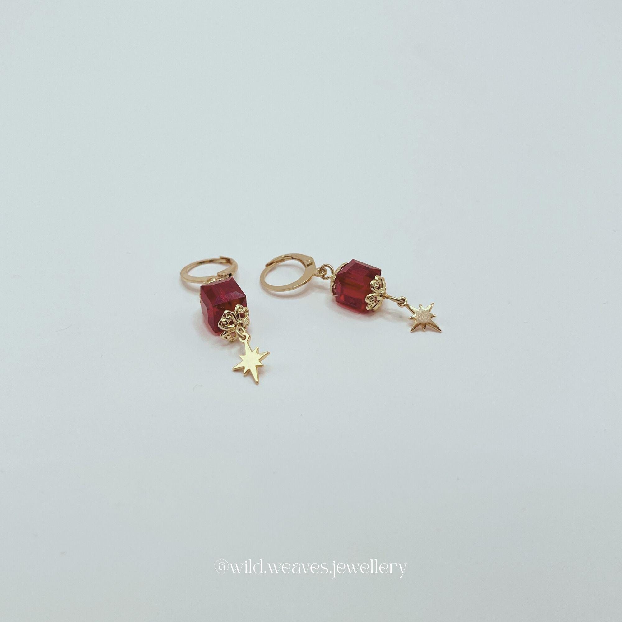The warm gold tones paired with the deep red crystal make these the perfect accessory for Christmas gatherings, holiday parties, romantic evenings, or gifting moments. Their celestial aesthetic also appeals to lovers of astrology, spiritual jewelry, witchy accessories, and cosmic styles.