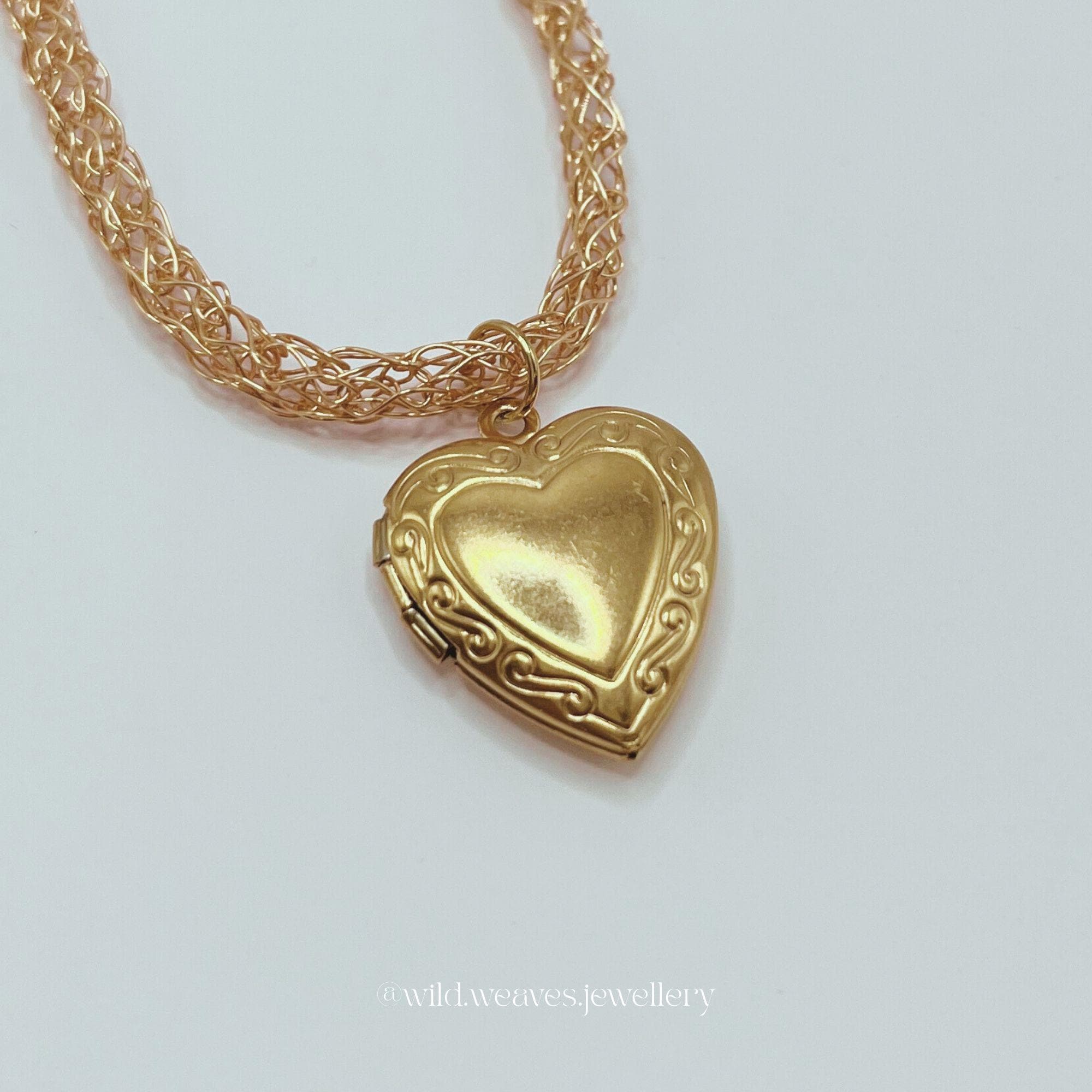 Handmade using a traditional wire-knitting technique, the chain has a soft, flexible drape that sets it apart from standard gold chain necklaces. The locket opens, allowing you to store a tiny photo, note, or keepsake: transforming it into a memory locket pendant that carries a personal touch.