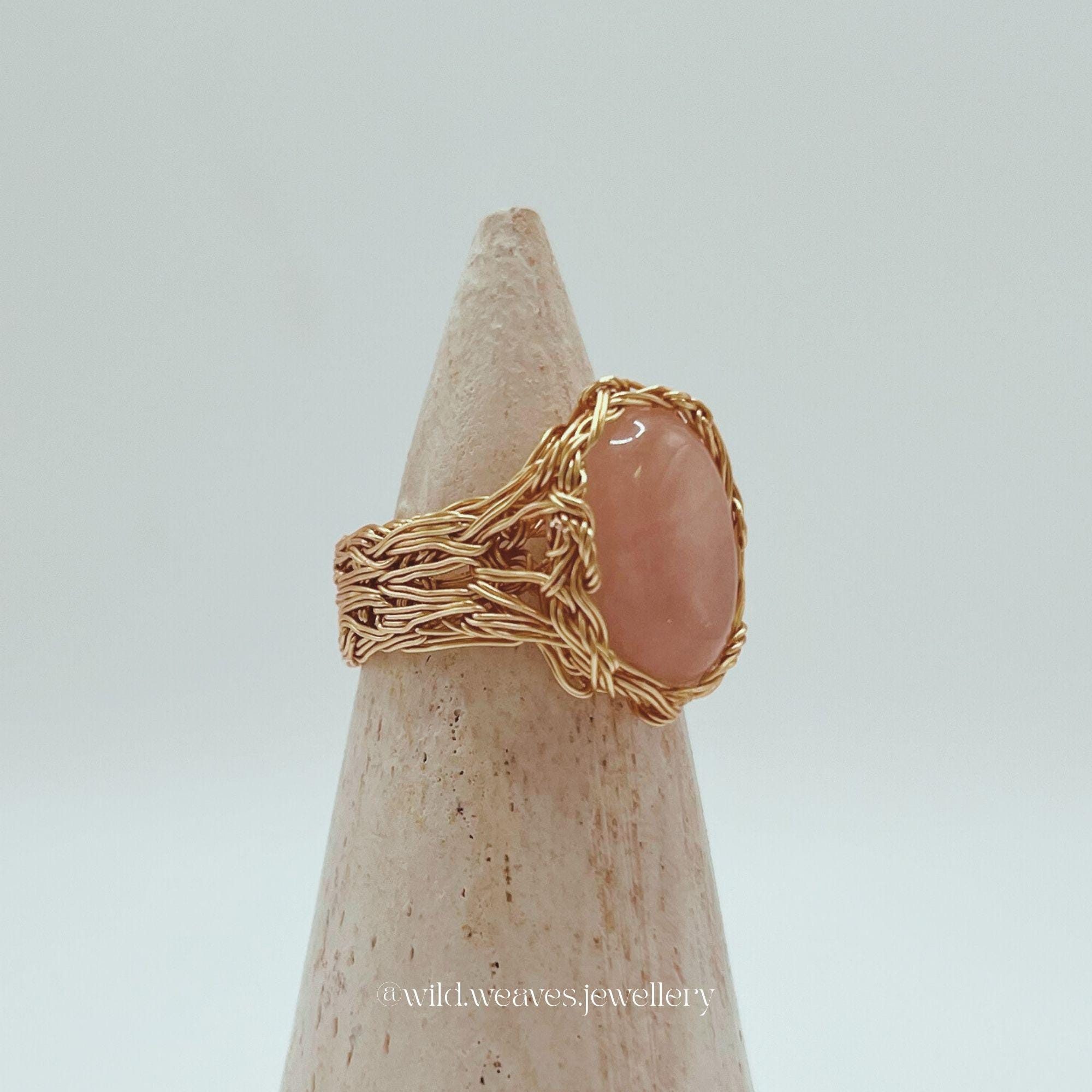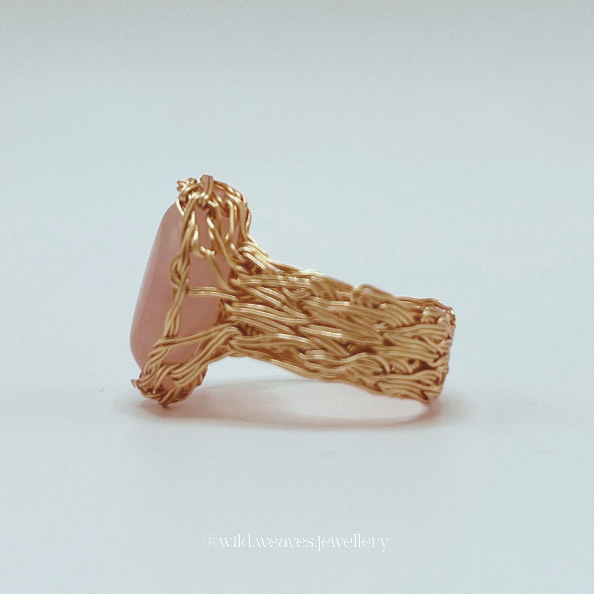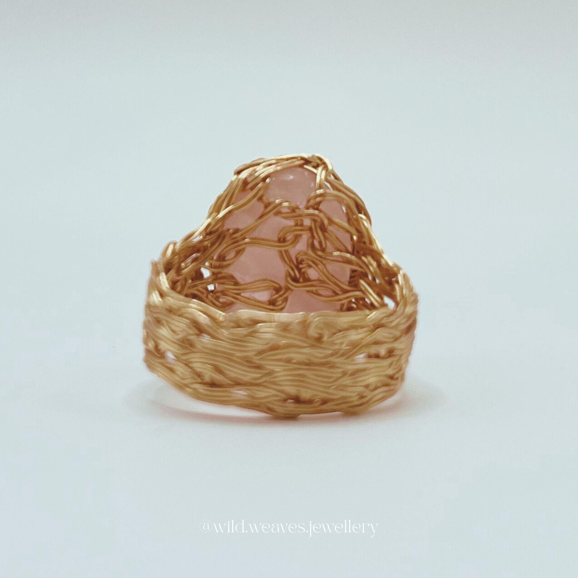 Featuring an oval rose quartz set in hand-knitted 18k gold plated wire, this statement ring blends vintage charm with modern artisan design.