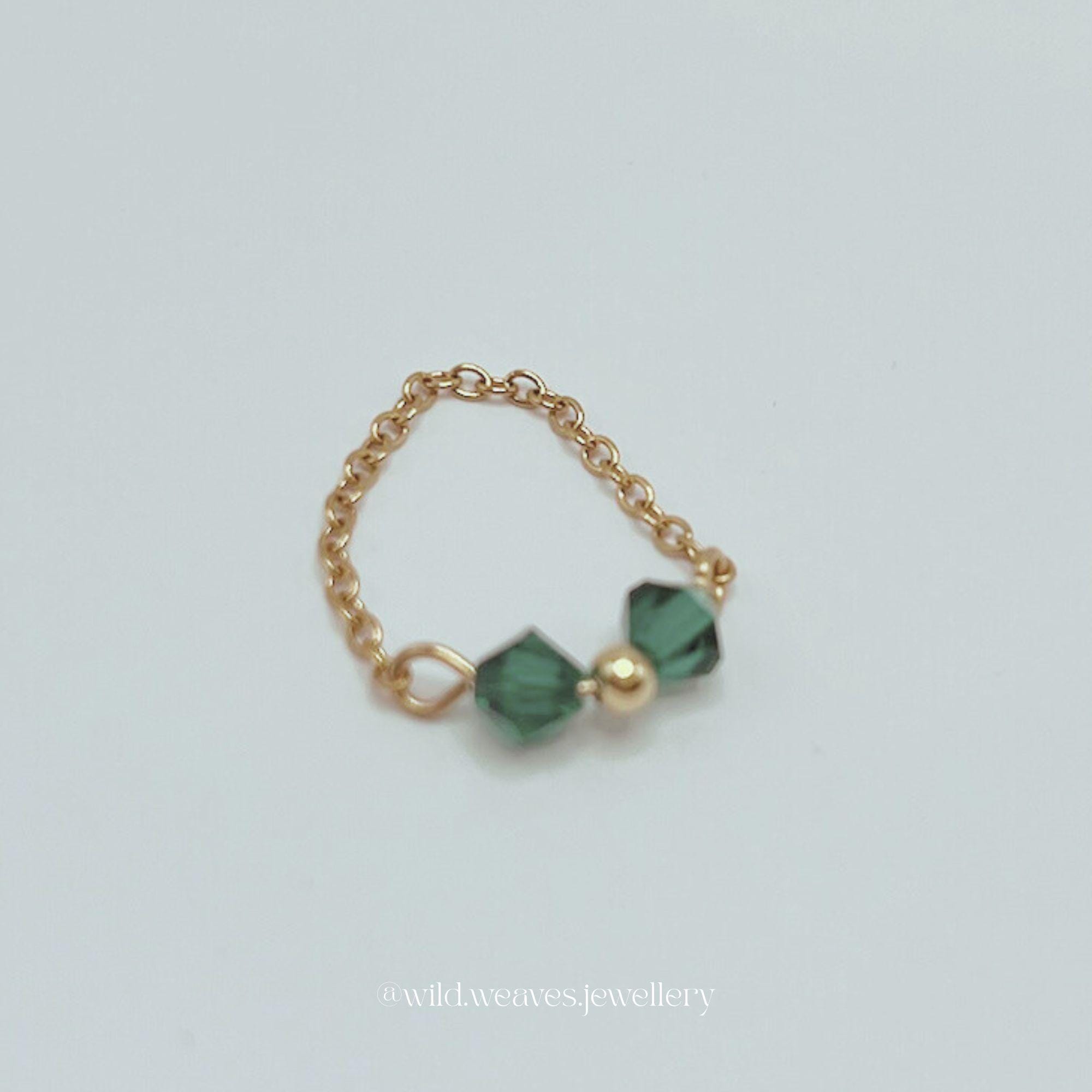 This dainty gold Swarovski mini ring is a delicate yet expressive gold plated crystal chain ring, handmade to bring subtle sparkle and modern elegance to your everyday style. Designed as a lightweight, adjustable gold ring, it features colourful Swarovski crystal beads woven into a minimalist stainless steel chain for effortless wear. Whether worn alone or stacked, this handmade gold mini ring with crystals adds a refined pop of colour to any look.