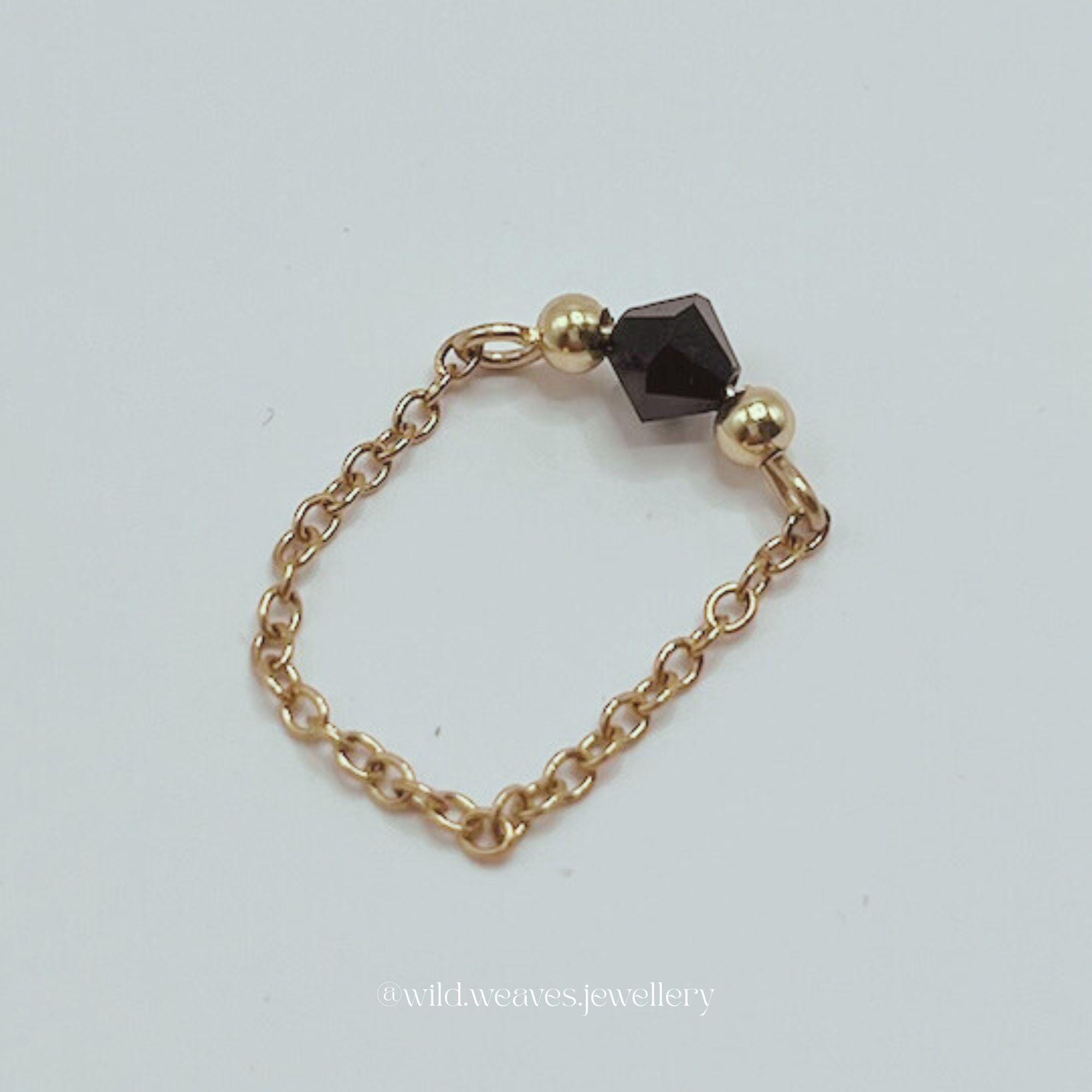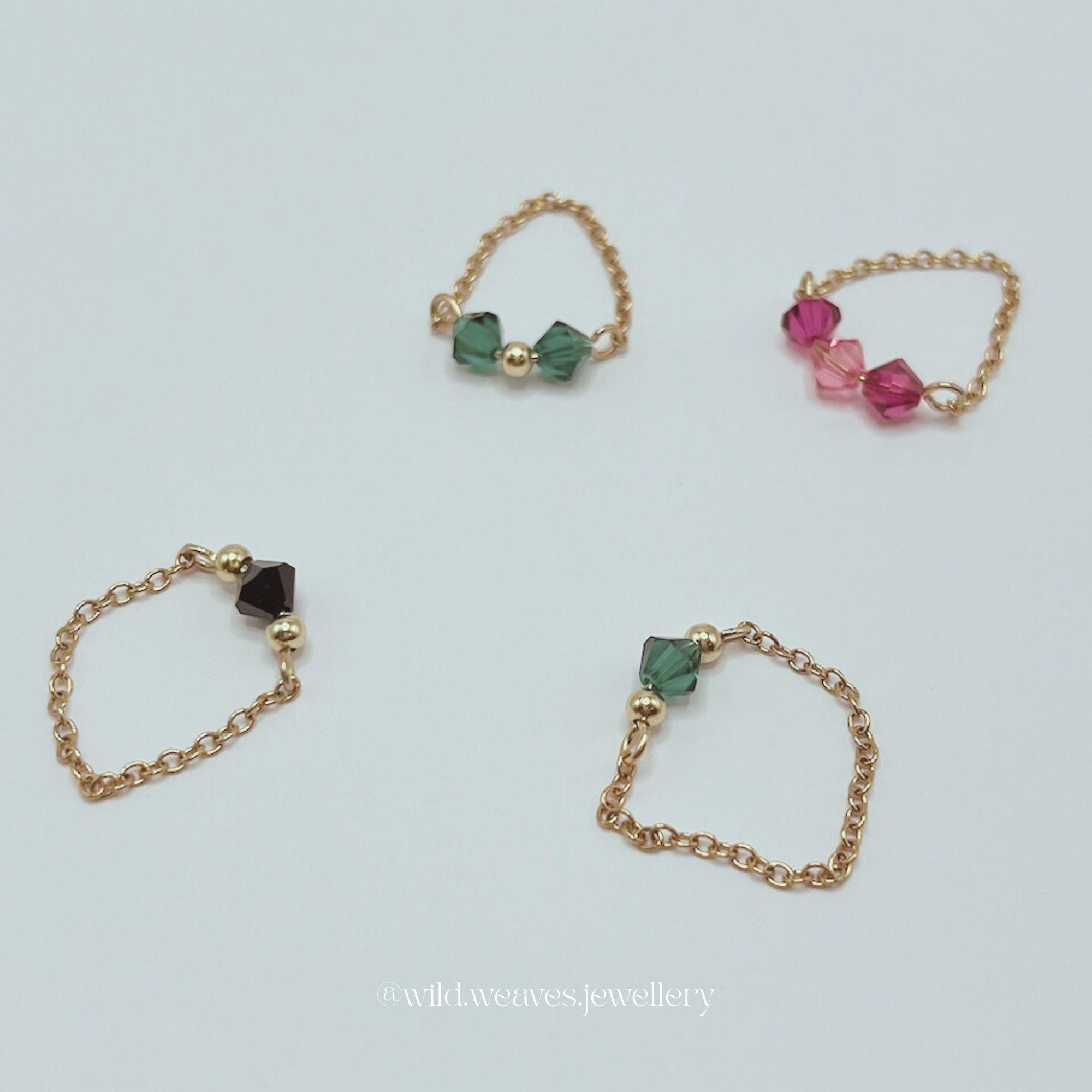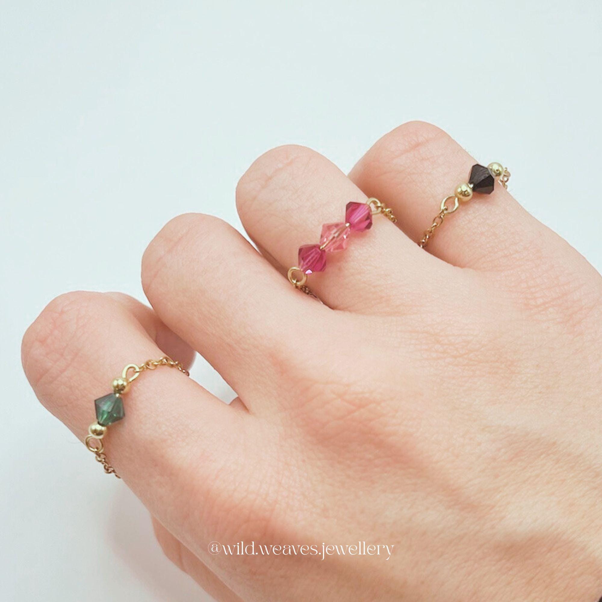Each ring is carefully handcrafted using stainless steel chains and pins adorned with genuine Swarovski glass seed beads, available in a beautiful spectrum of shades: pink, fuchsia, black, green, orange, blue, light blue, clear, yellow, lilac, and light green. The result is a delicate gold ring with colourful crystals that feels playful yet timeless: perfect for lovers of minimalist jewelry and subtle statement pieces.