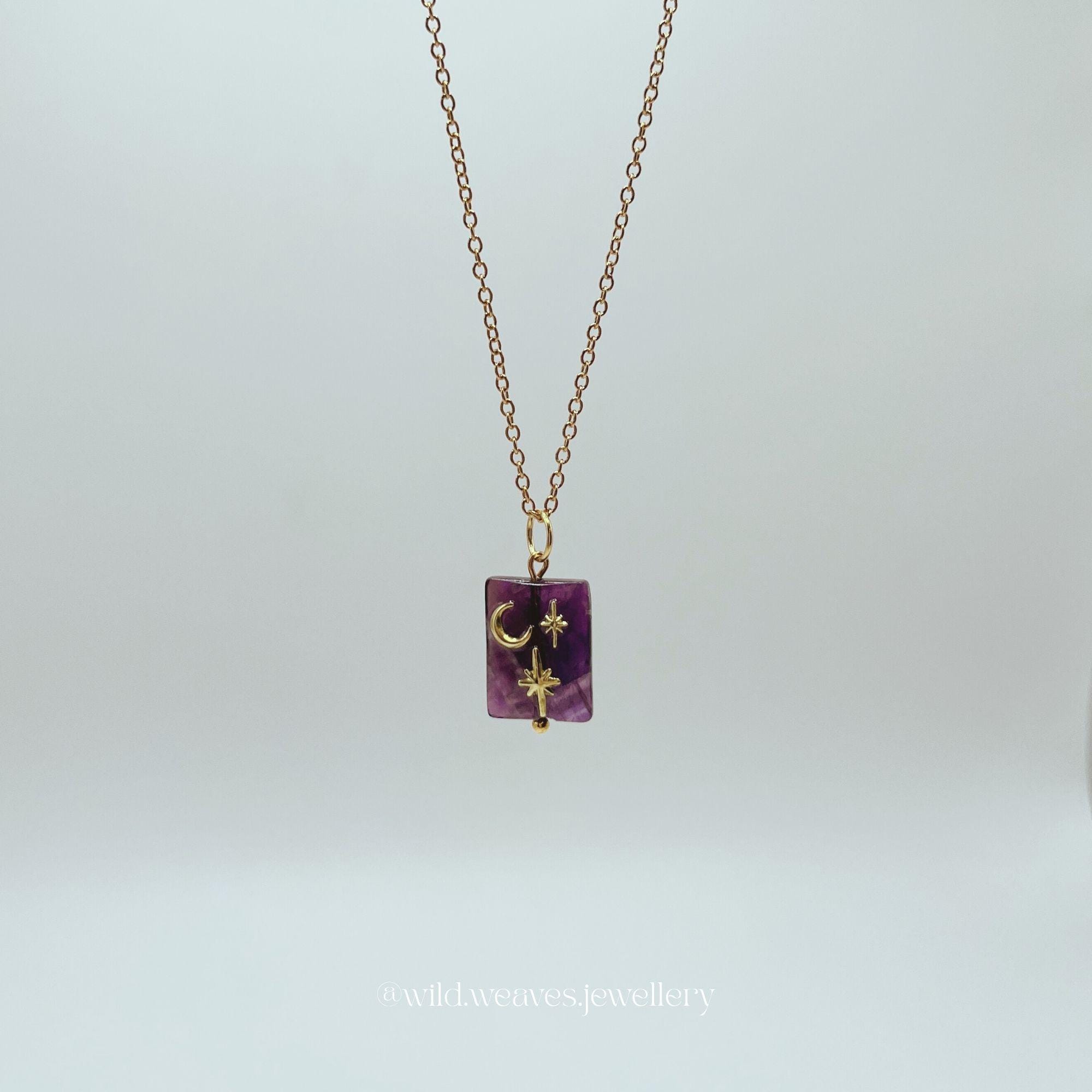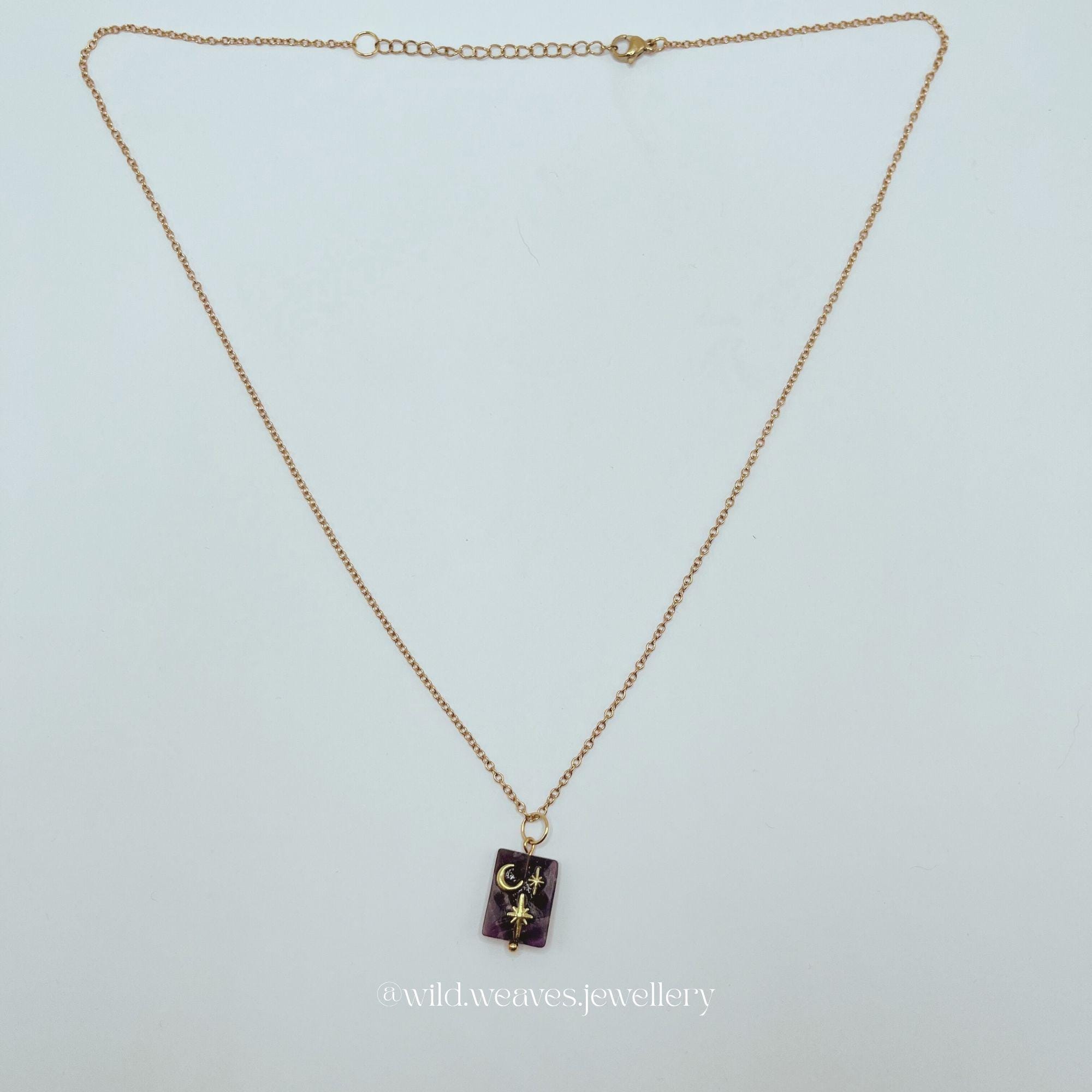 • Necklace: Stainless steel chain, pins & jump rings, rectangular faceted amethyst, golden alloy moon & star appliqués