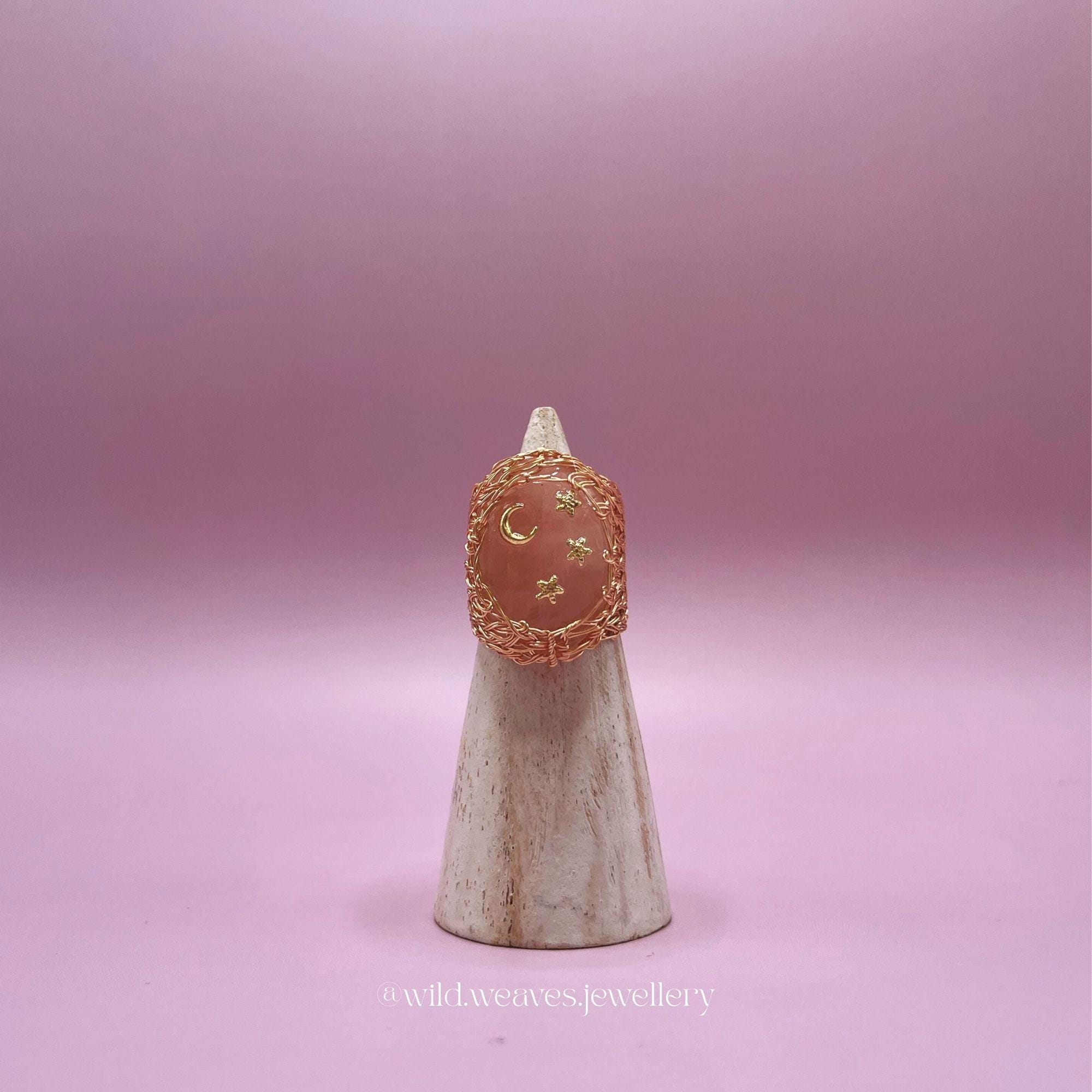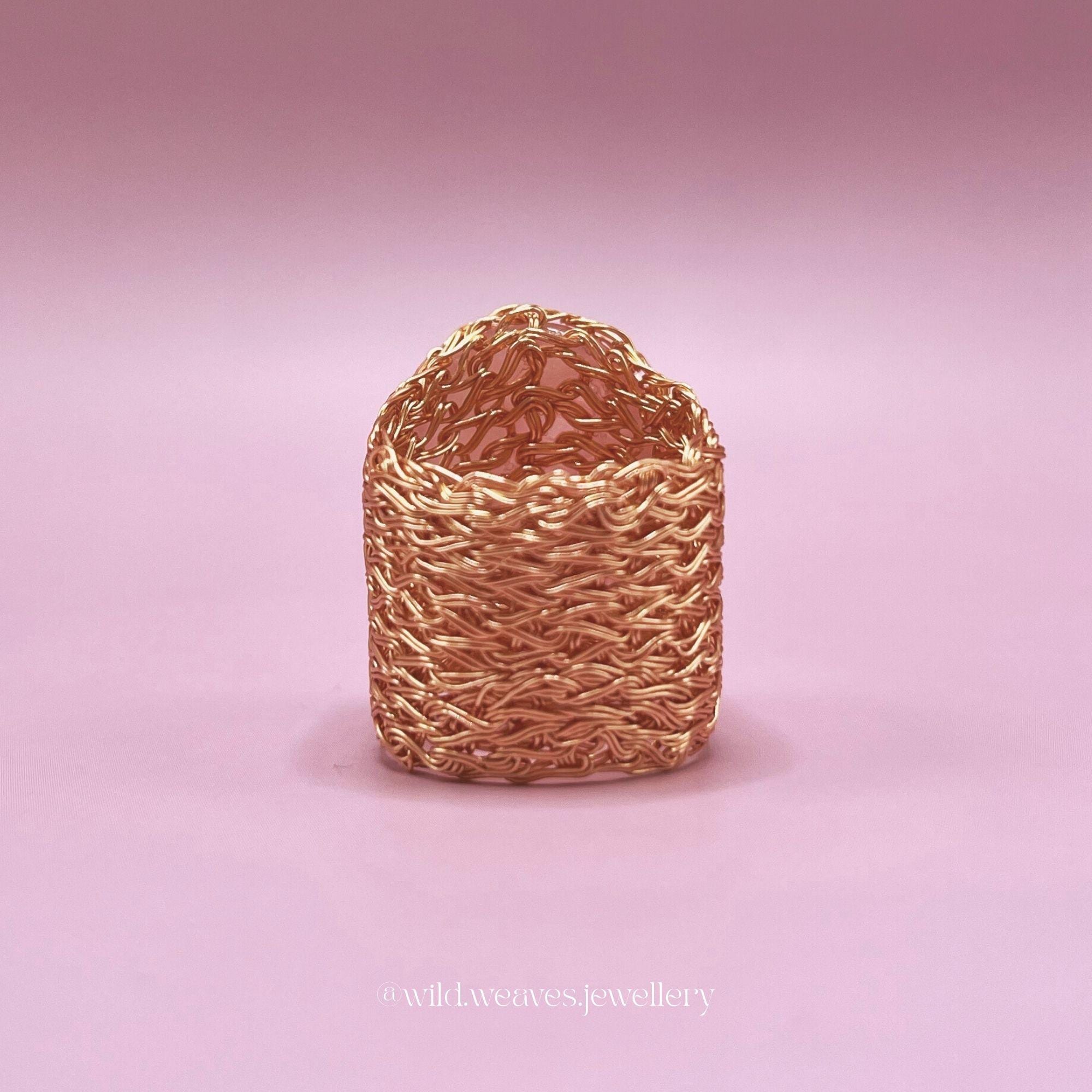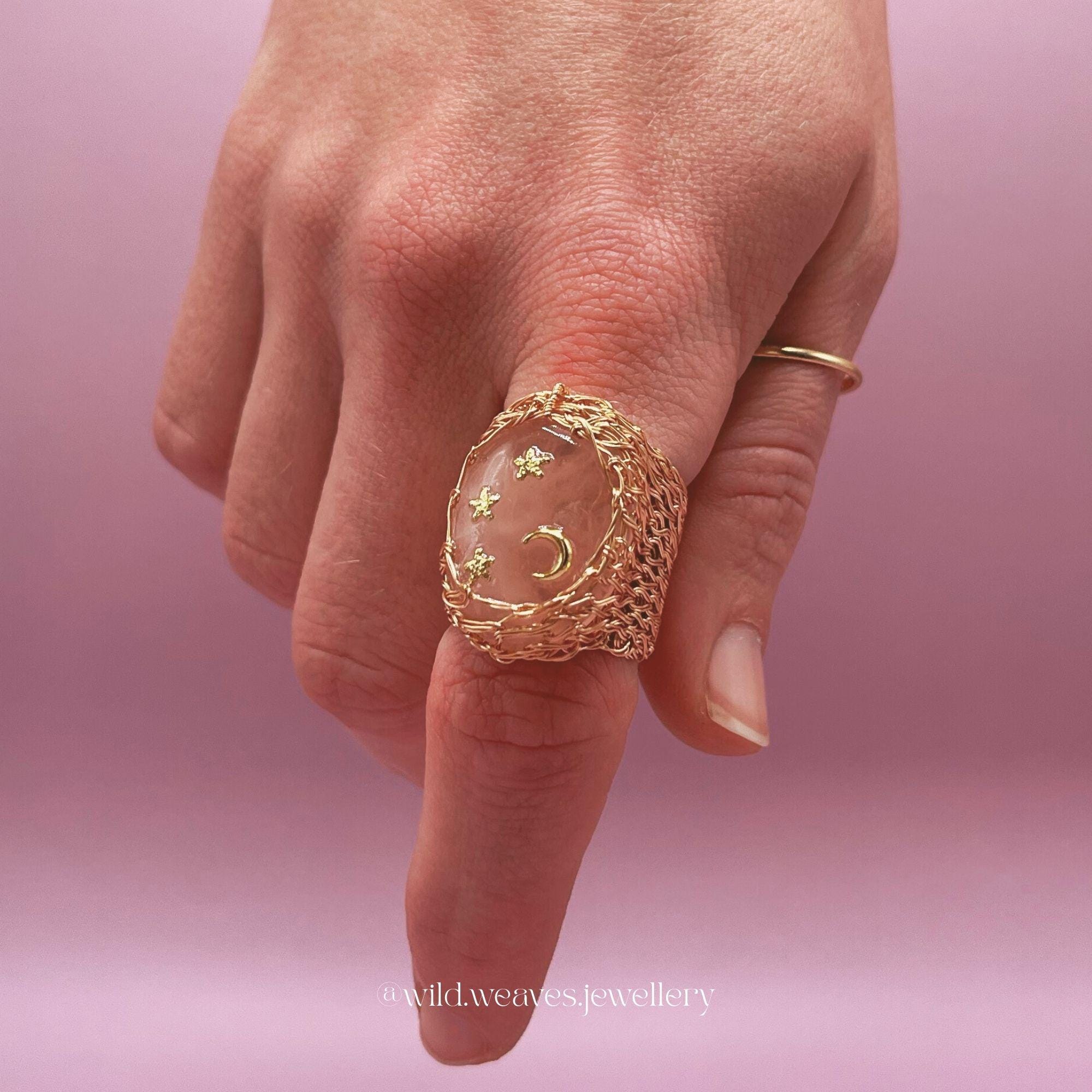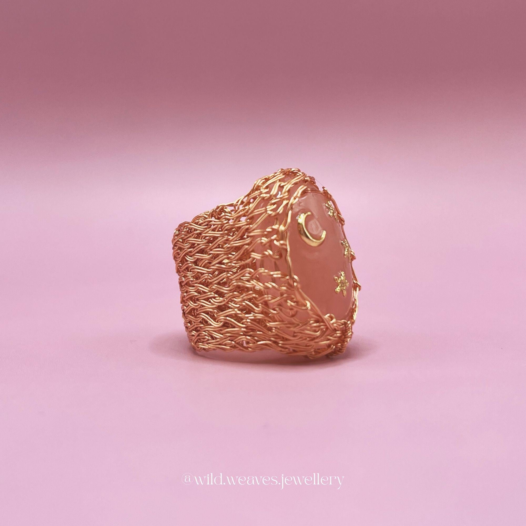 Crafted using double strands of 18k gold plated copper wire, this ring showcases a luminous starry rose quartz gemstone (approx. 35 x 20 mm): known as the stone of love, compassion, and emotional balance. Its textured, knitted design blends contemporary elegance with artisanal craftsmanship, making it a true statement accessory for confident, style-forward women.