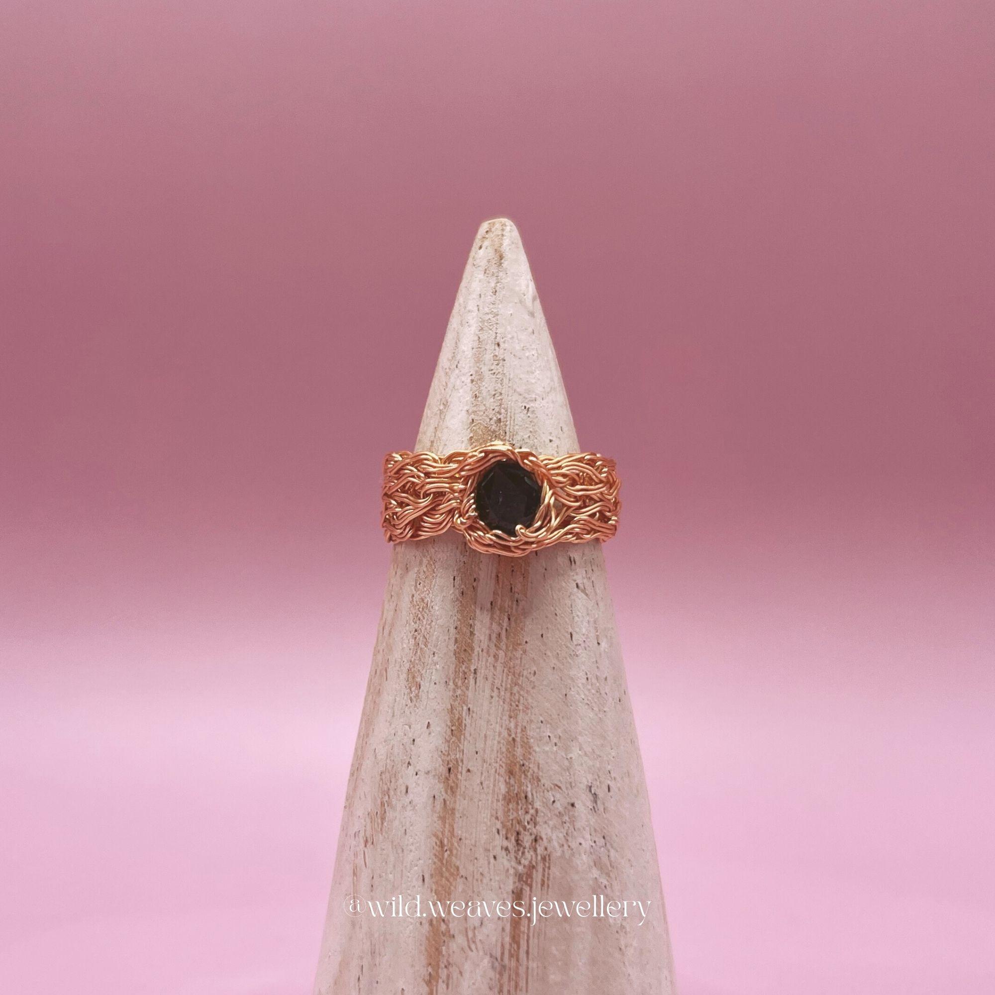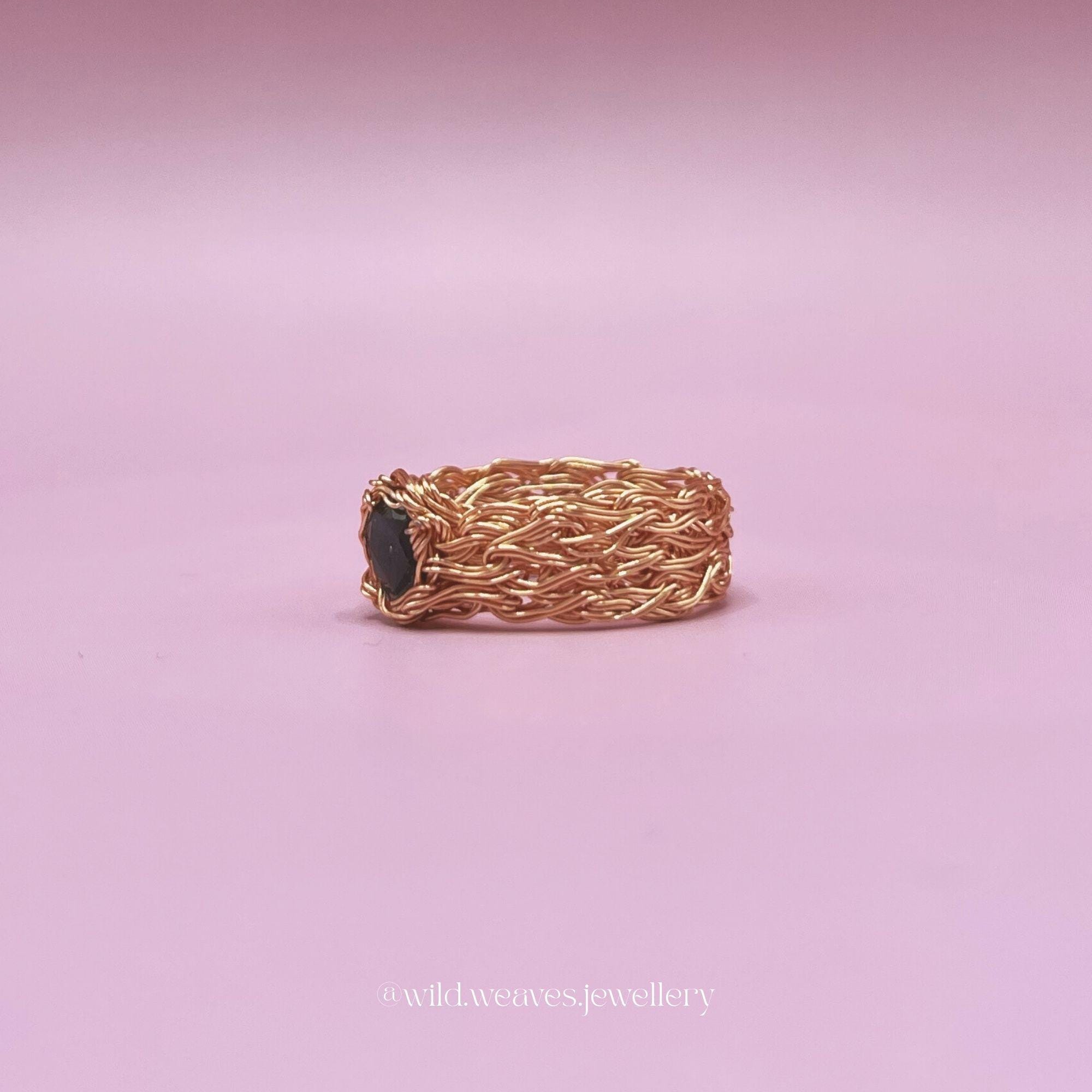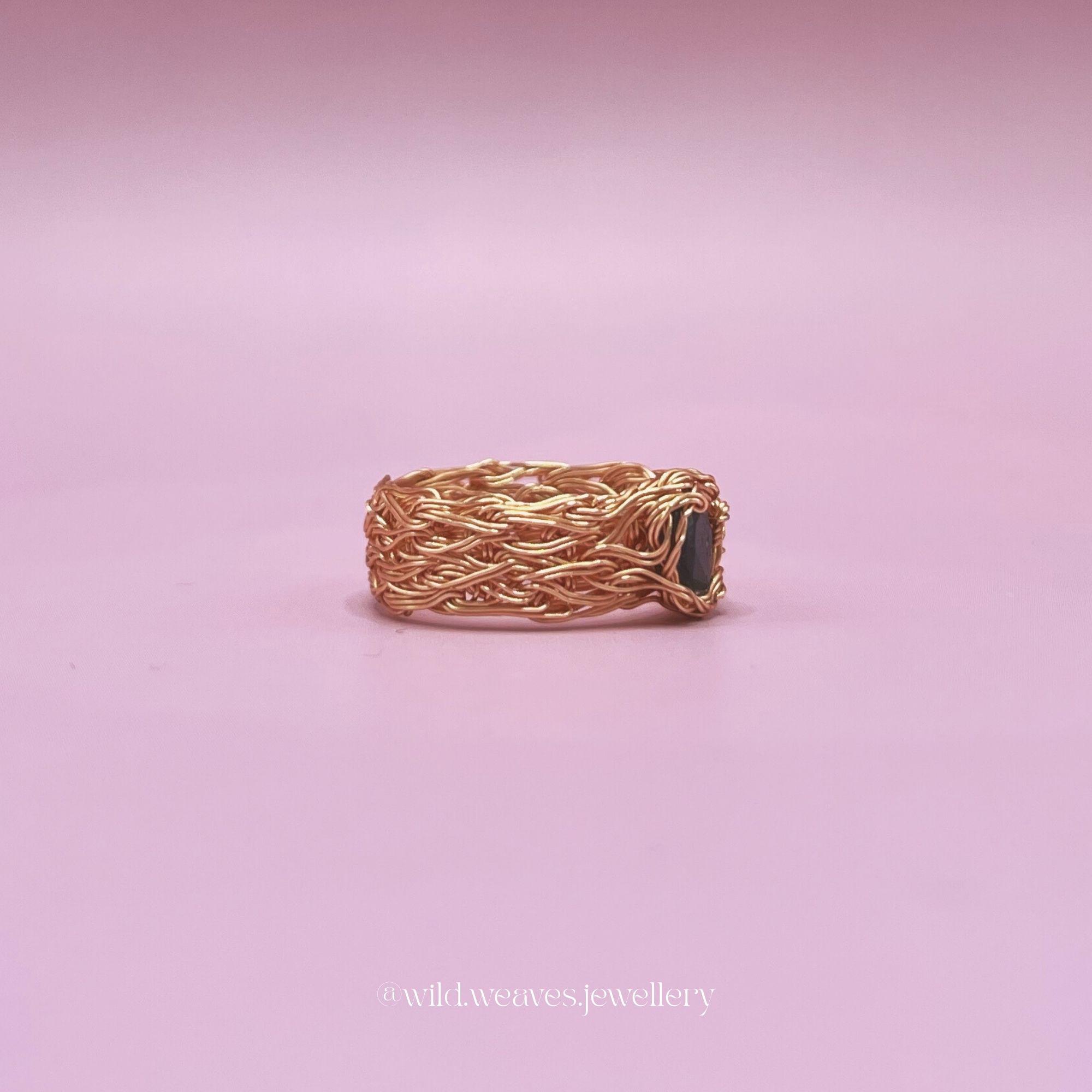 Each ring is carefully hand-knitted and wire wrapped, creating a lightweight yet durable design that wraps the finger in warm golden texture. The deep blue sapphire gemstone captures light beautifully, adding a subtle statement to this otherwise delicate silhouette. Whether worn alone as a dainty cocktail ring gold or stacked with other favorites, it brings effortless elegance to any look.