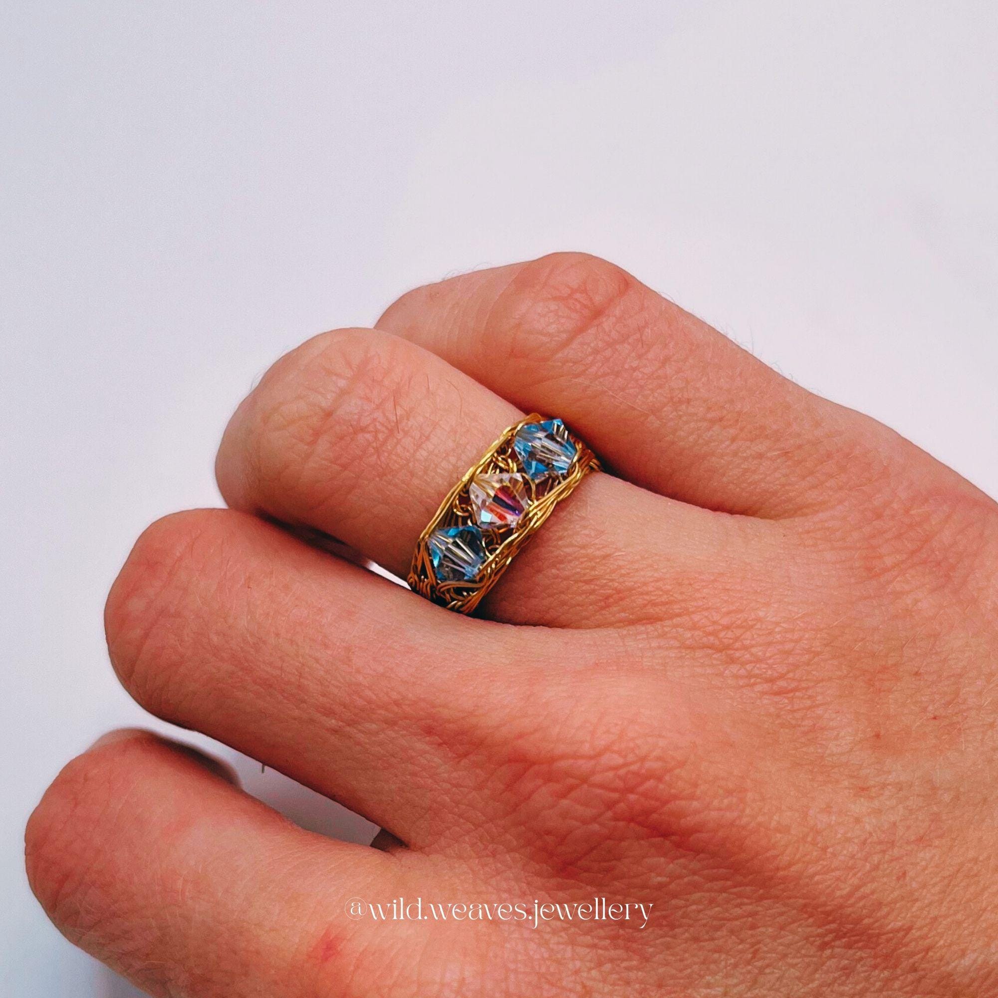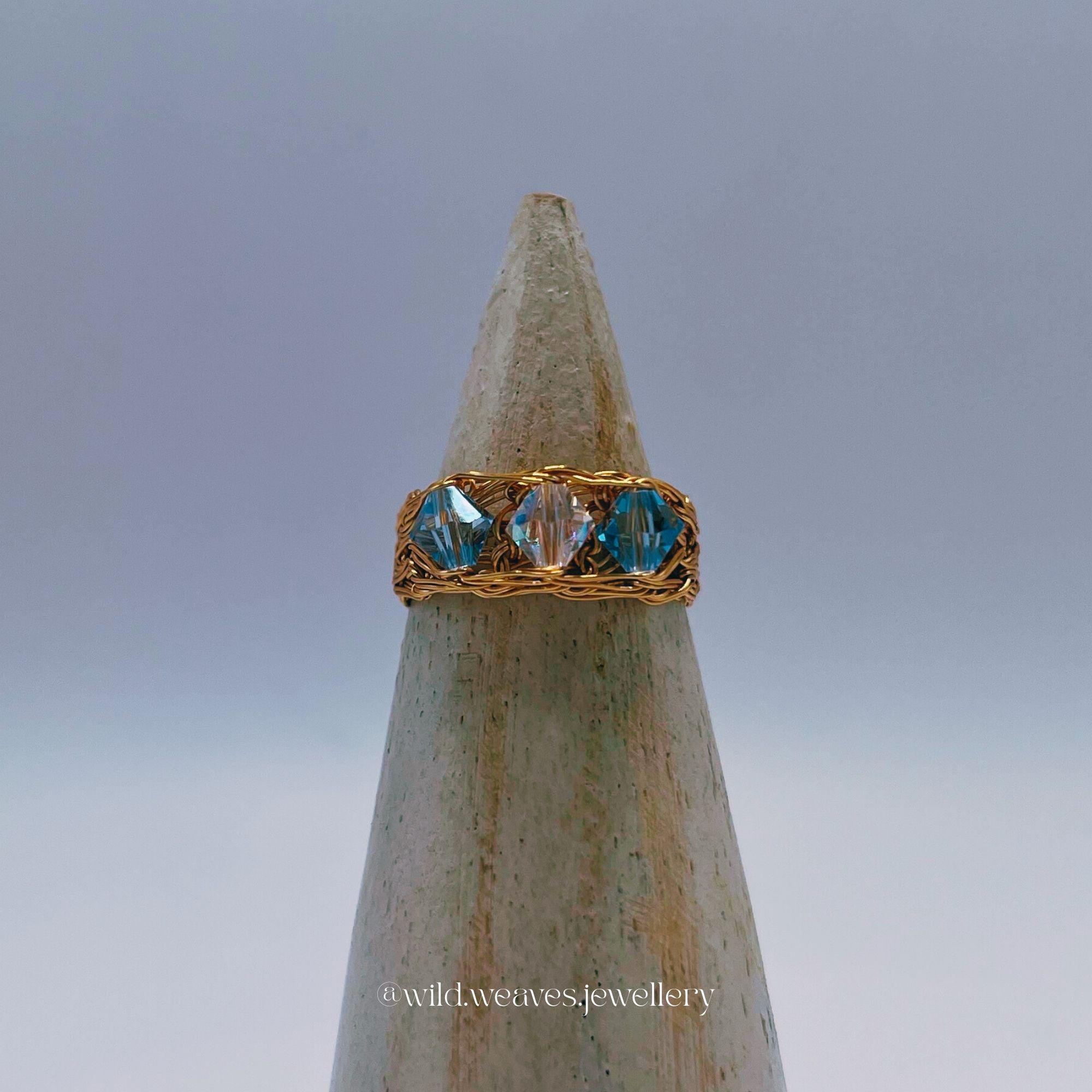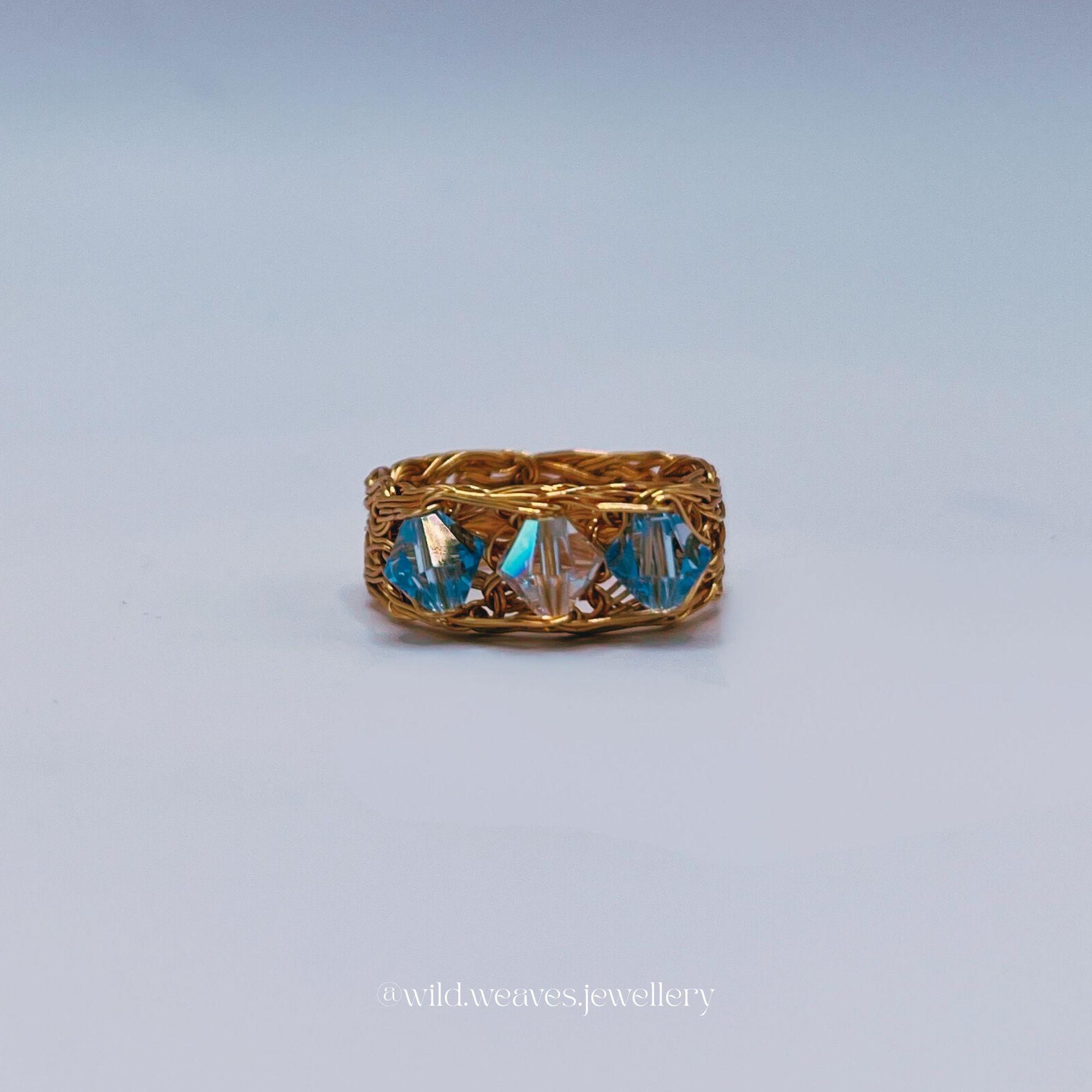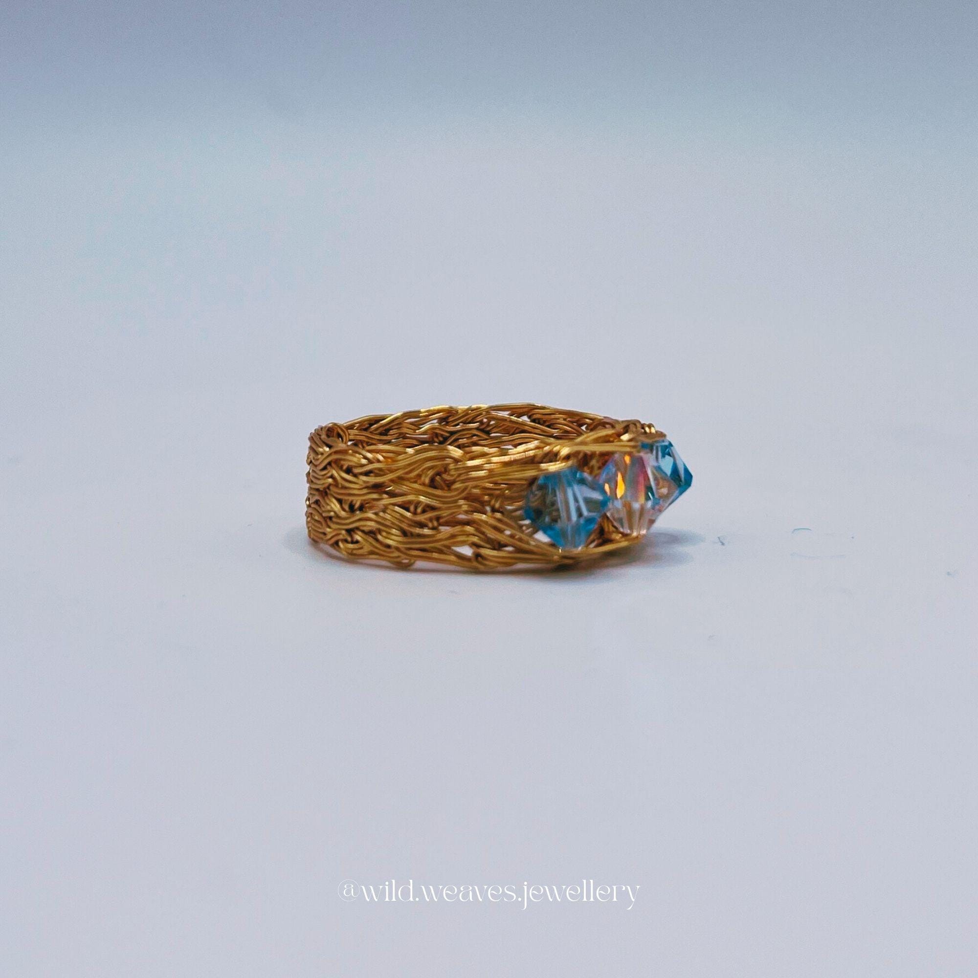 Each ring is carefully hand-knitted and wire wrapped, creating a lightweight yet durable design that wraps the finger in warm golden texture. The two blue Swarovski seed crystals paired the clear centrepiece capture light beautifully, adding a subtle statement to this otherwise simple silhouette. Whether worn alone as a dainty multi-stone cocktail ring gold or stacked with other favorites, it brings effortless elegance to any look.