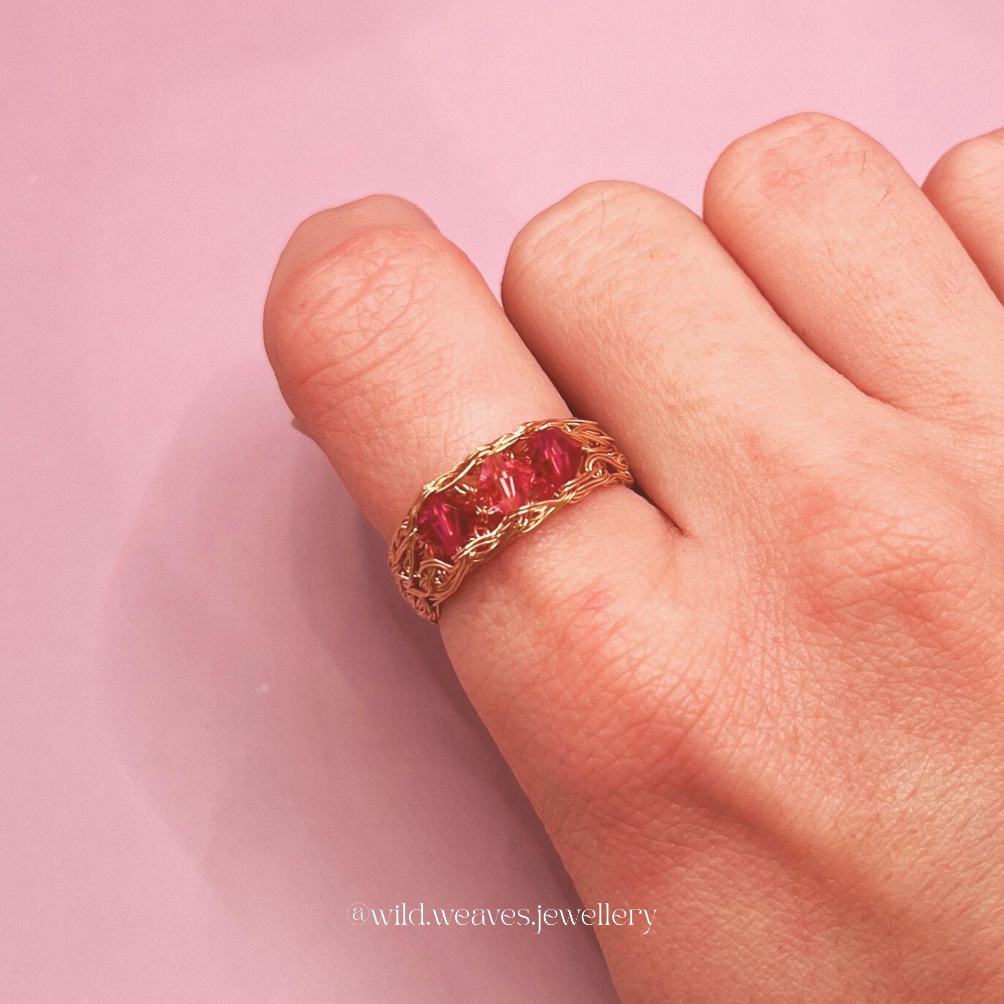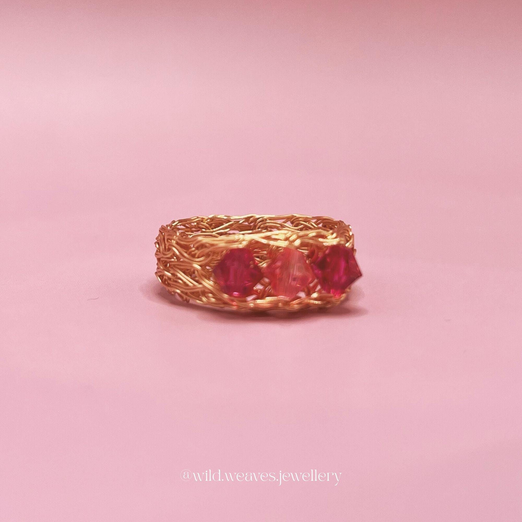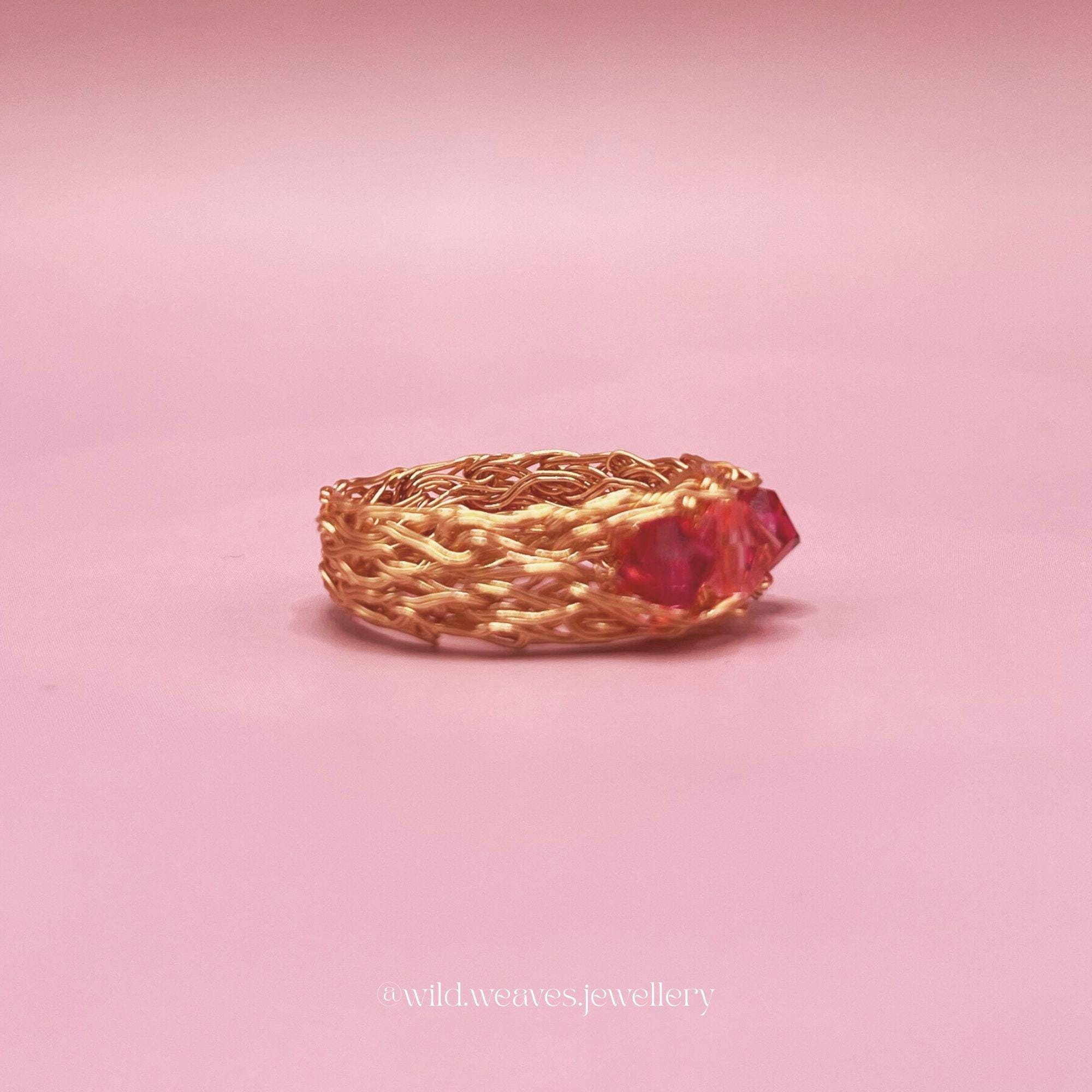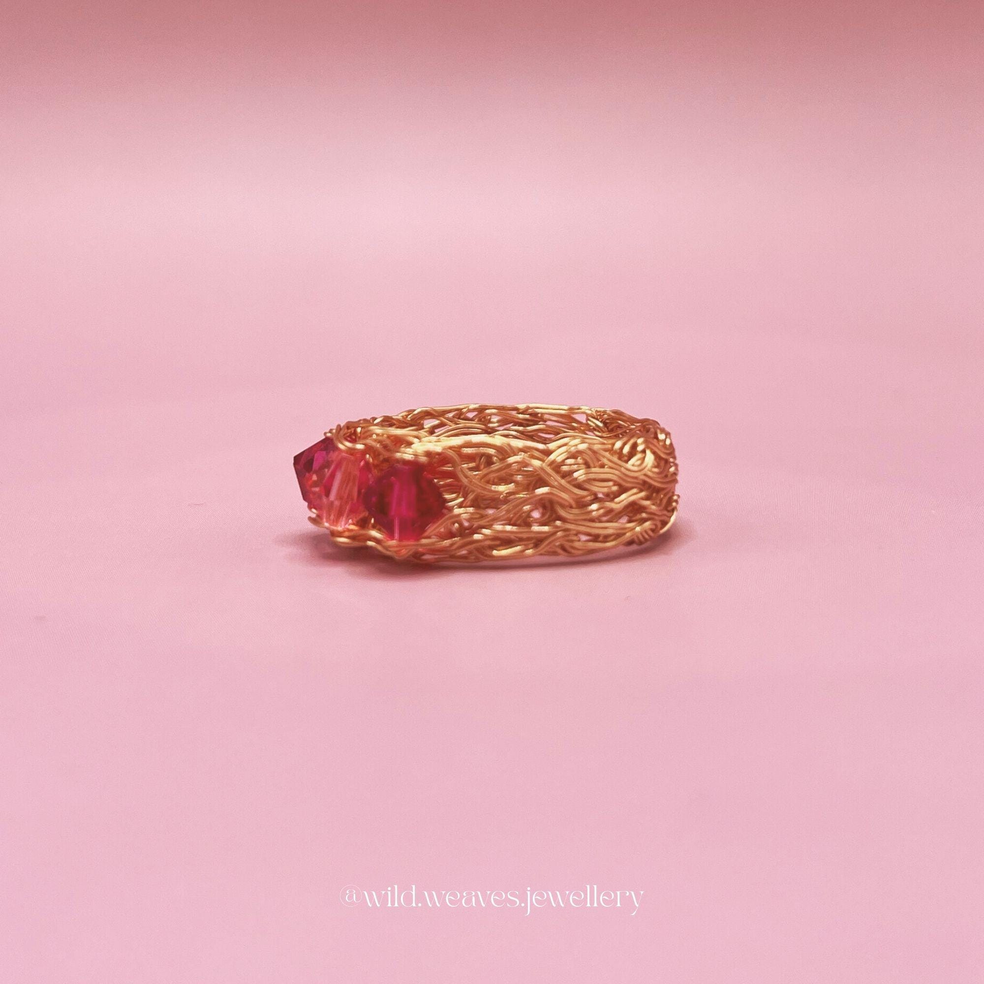 Each ring is carefully hand-knitted and wire wrapped, creating a lightweight yet durable design that wraps the finger in warm golden texture. The two blue Swarovski seed crystals paired the clear centrepiece capture light beautifully, adding a subtle statement to this otherwise simple silhouette. Whether worn alone as a dainty multi-stone cocktail ring gold or stacked with other favorites, it brings effortless elegance to any look.