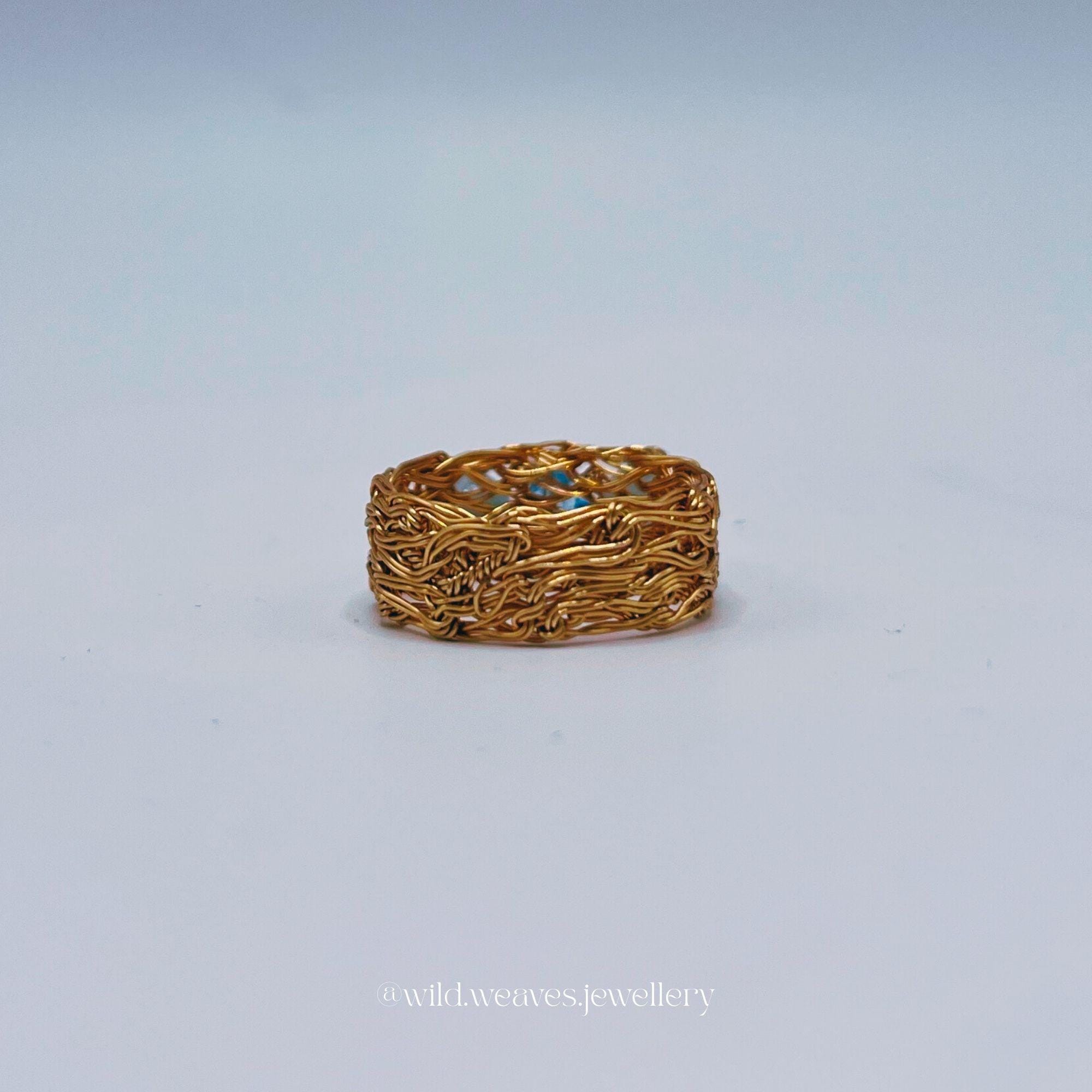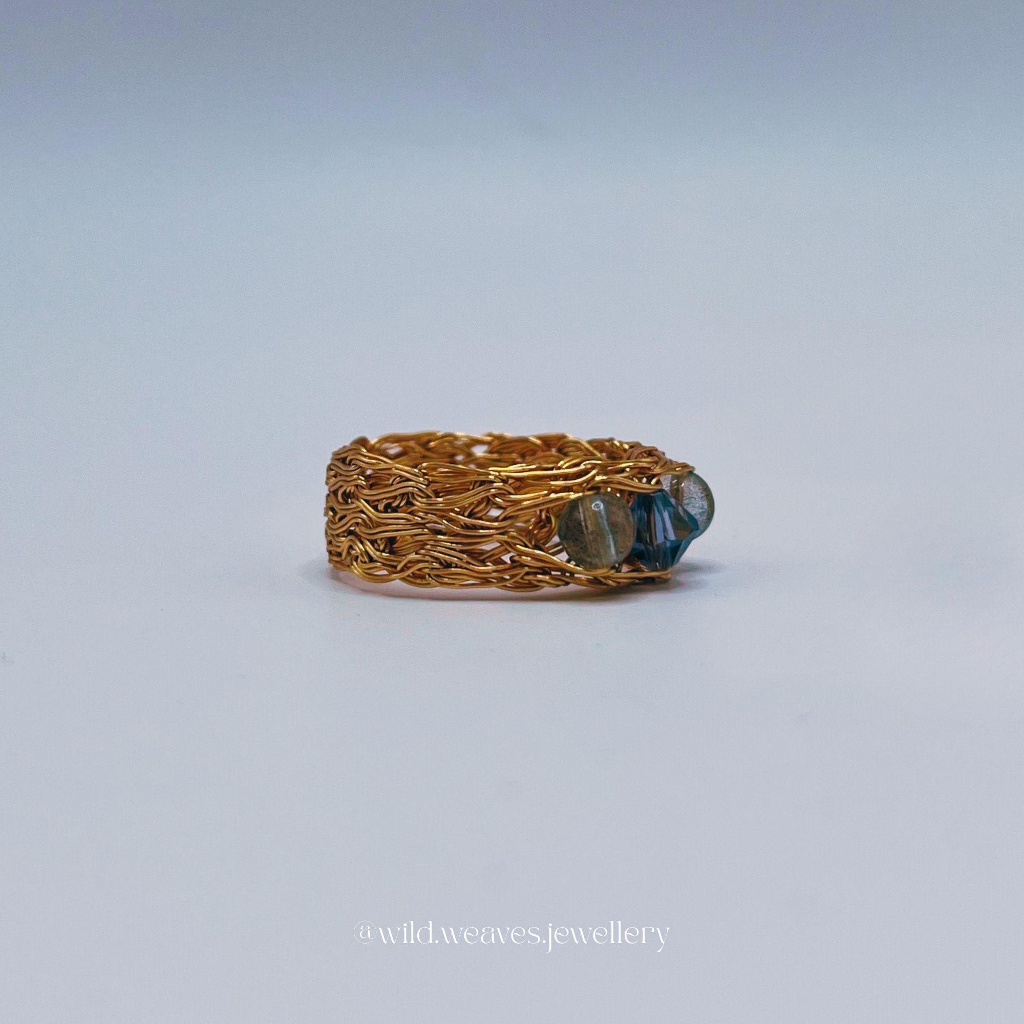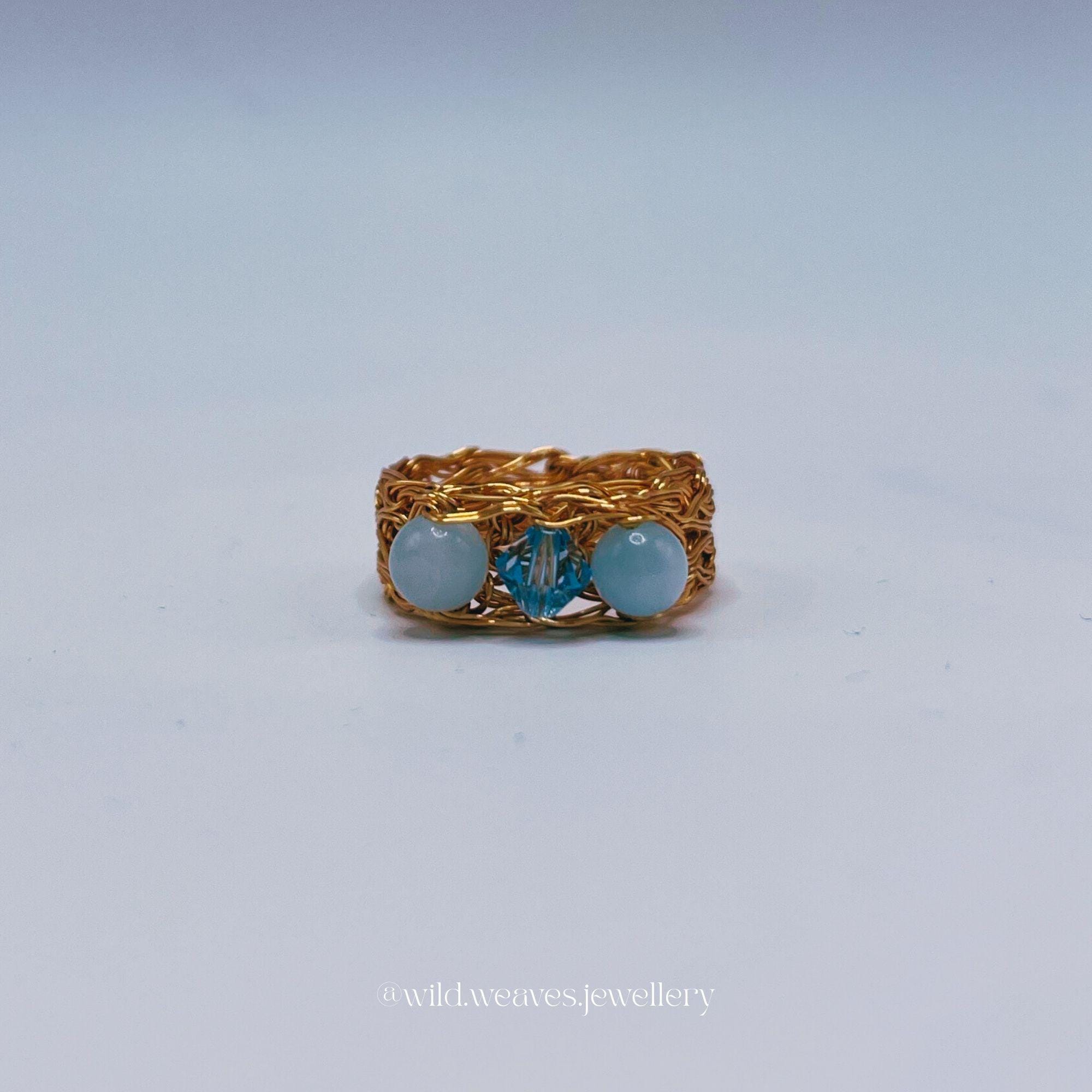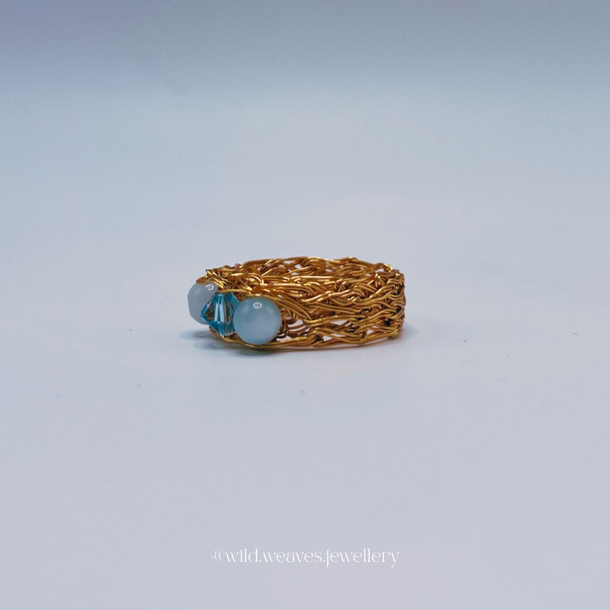 Hand-knitted from double strands of 18k gold plated copper wire, this unique design features two genuine aquamarine beads and a light blue Swarovski seed crystal, forming a harmonious trio of calming ocean hues. The sculptural wire knit texture adds depth and character while remaining airy and comfortable for daily wear.