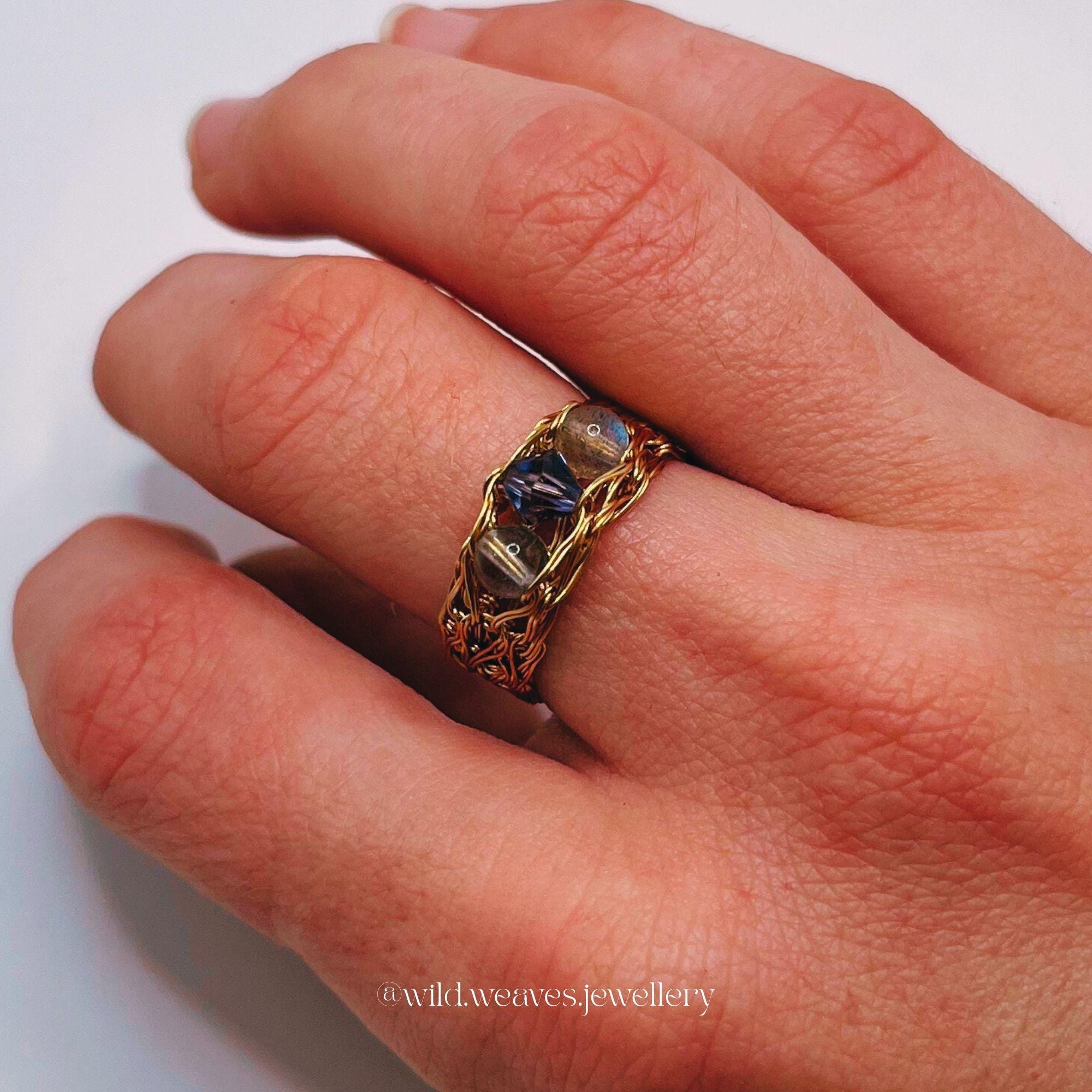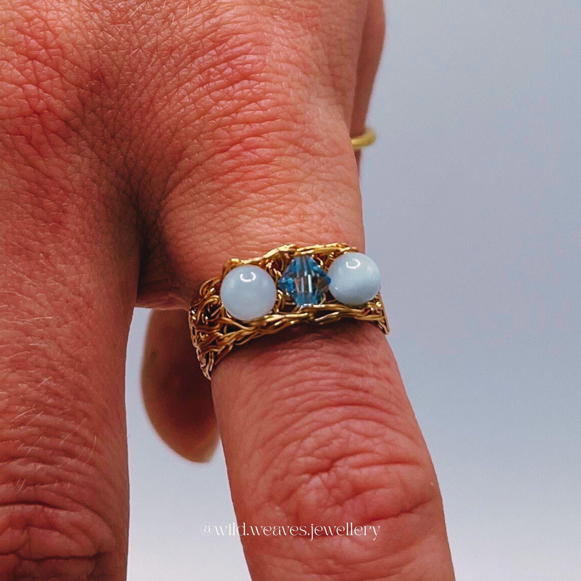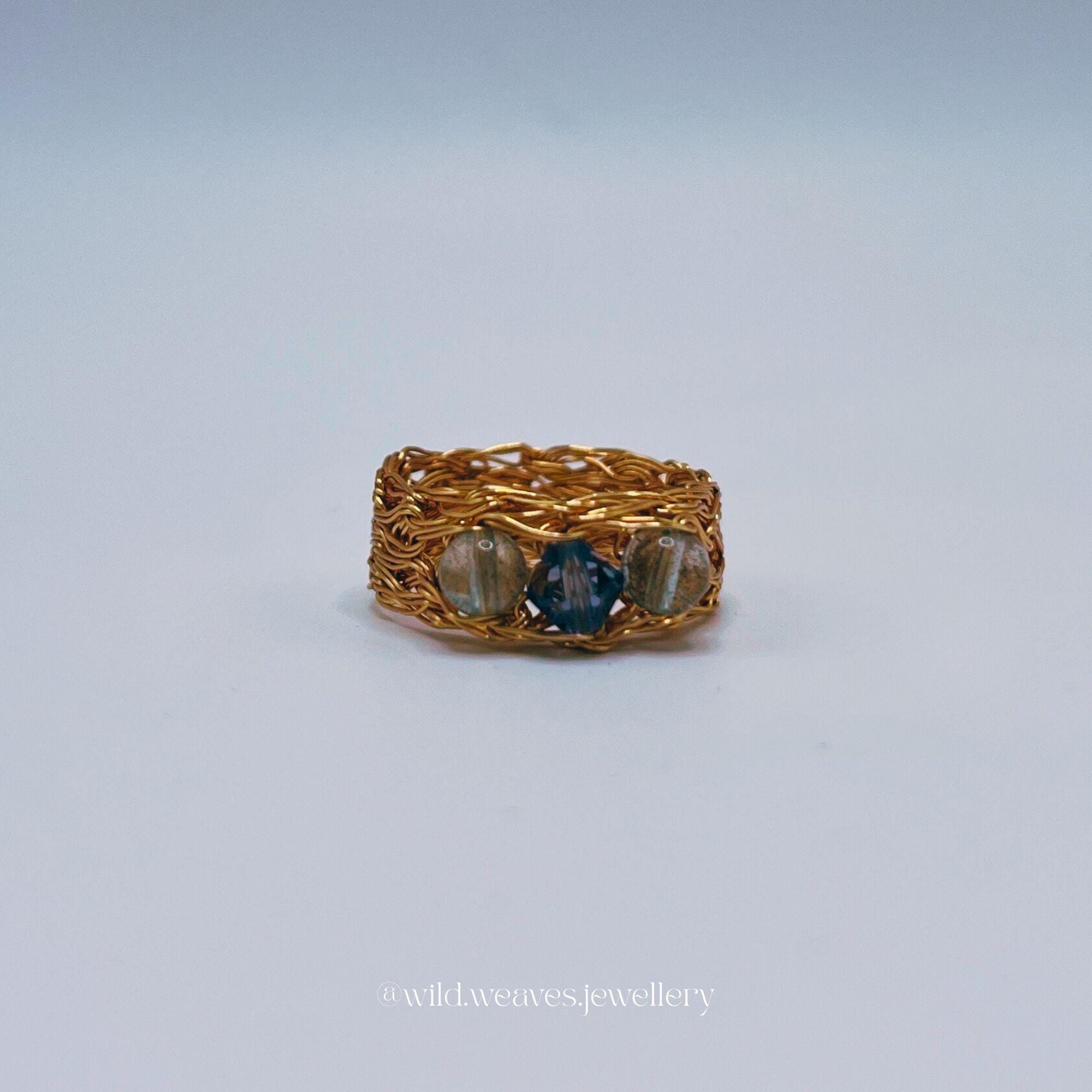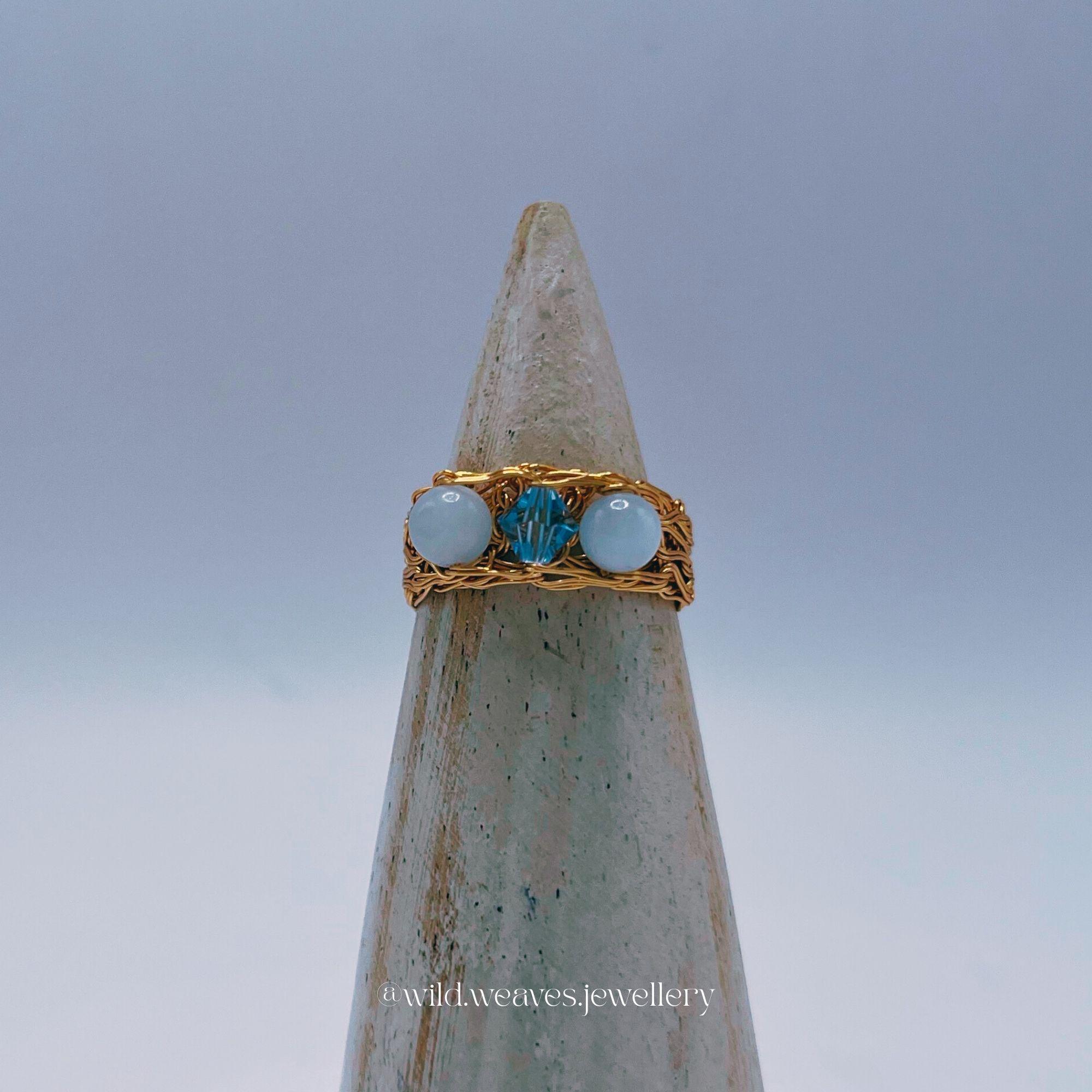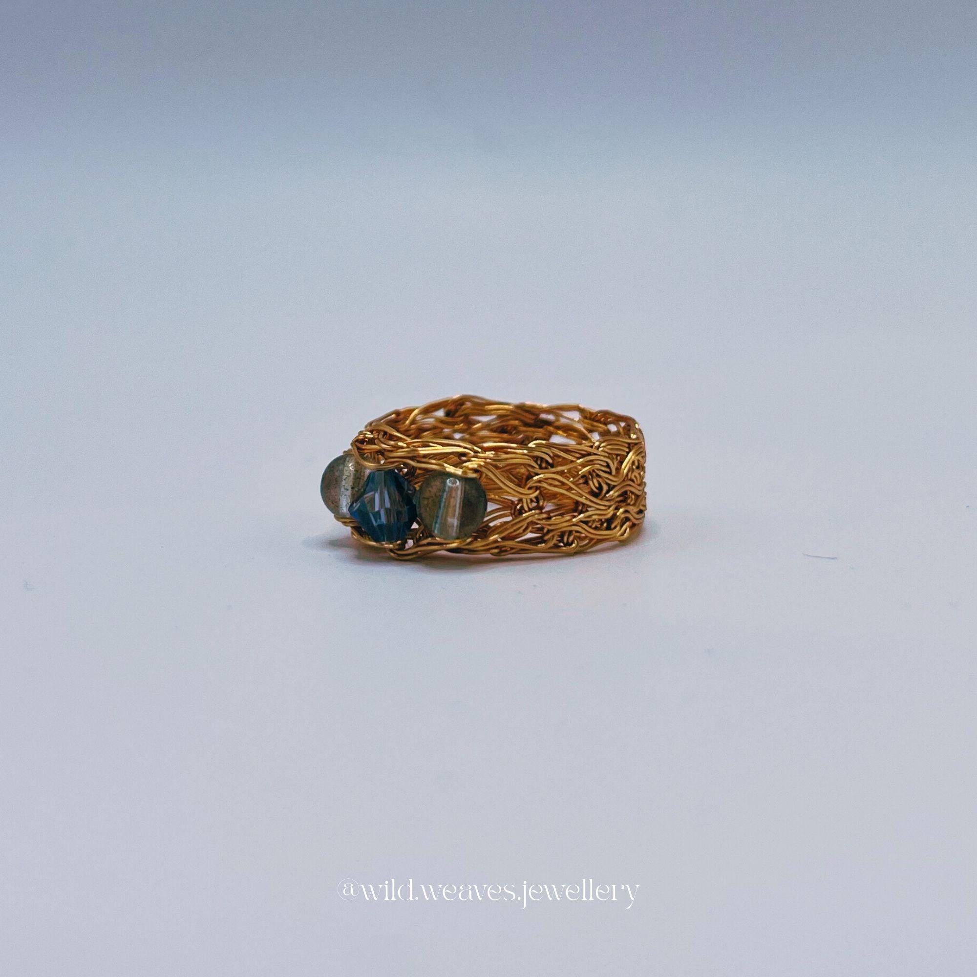 Hand-knitted from double strands of 18k gold plated copper wire, this unique design features two genuine aquamarine beads and a light blue Swarovski seed crystal, forming a harmonious trio of calming ocean hues. The sculptural wire knit texture adds depth and character while remaining airy and comfortable for daily wear.