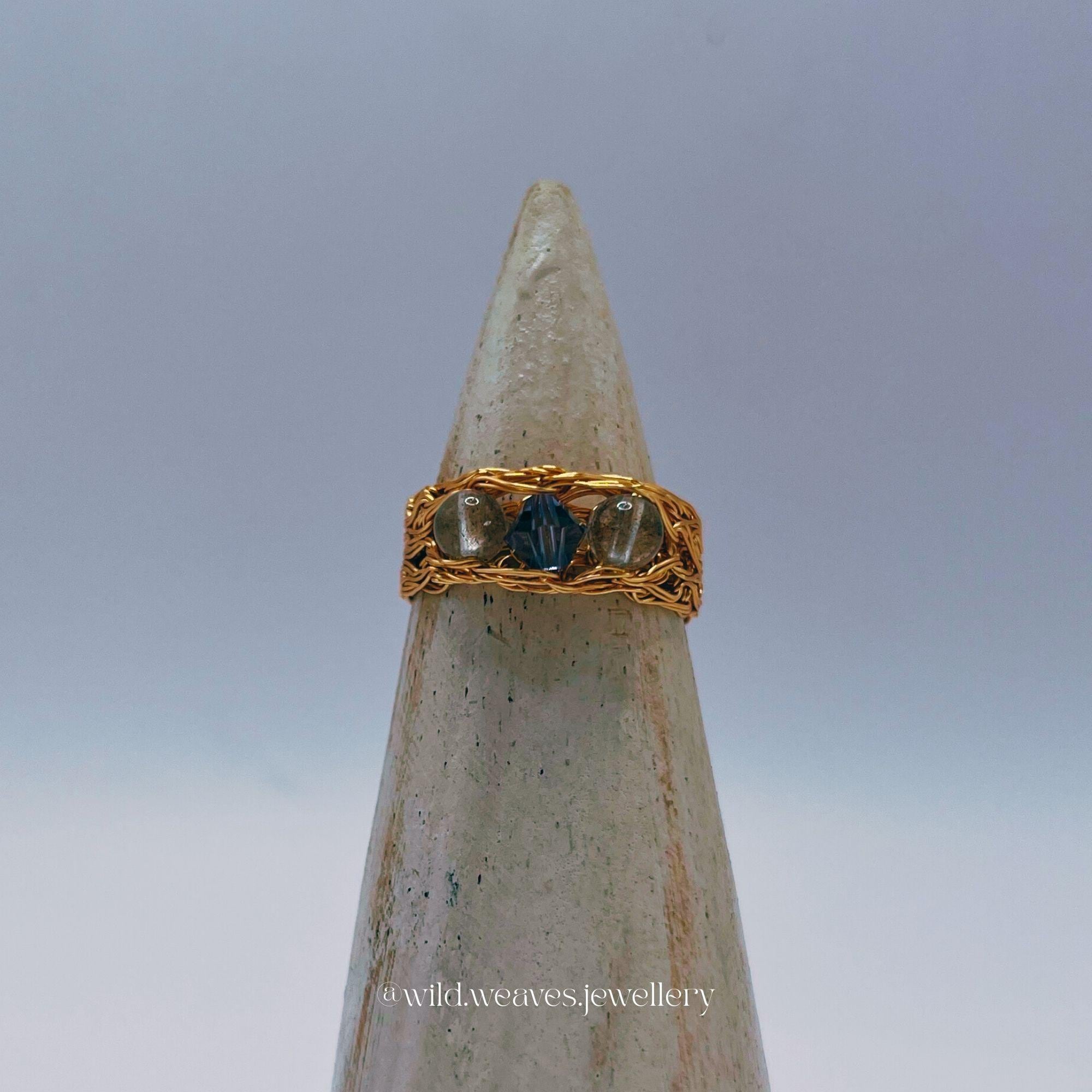 Hand-knitted from double strands of 18k gold plated copper wire, this unique design features two genuine labradorite beads and a purple Swarovski seed crystal, forming a harmonious trio of calming purple hues. The sculptural wire knit texture adds depth and character while remaining airy and comfortable for daily wear.